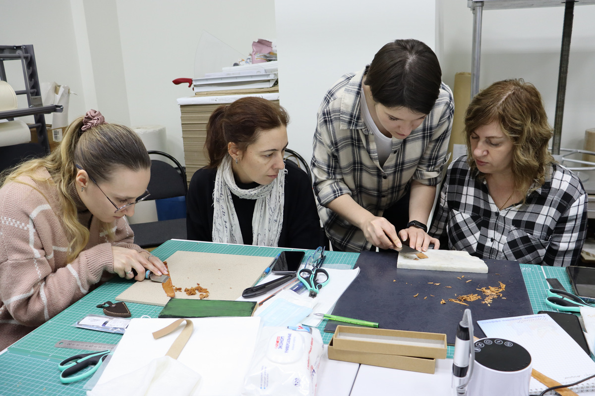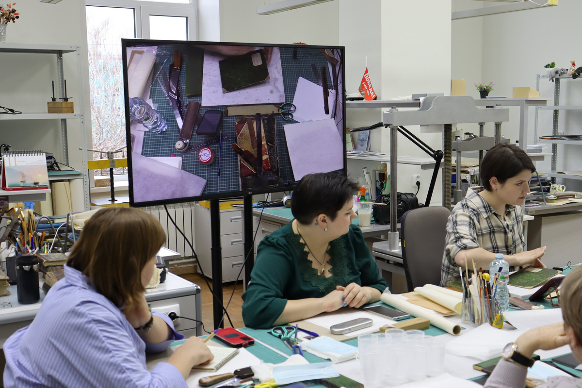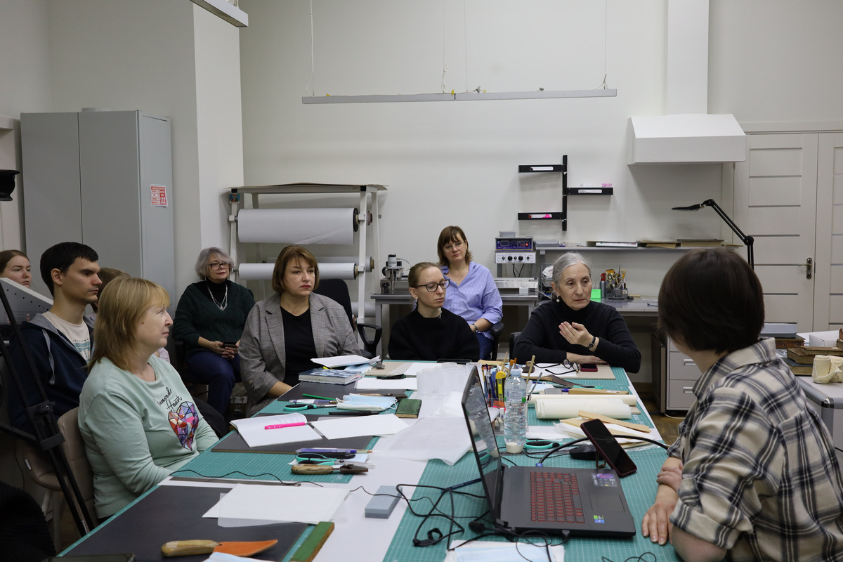 Затем художники-реставраторы под руководством специалиста учились работать со старой кожей, определять её вид, наблюдали влияние различных клеёв на материал. Обсуждали выбор методов реставрации в зависимости от вида переплёта.