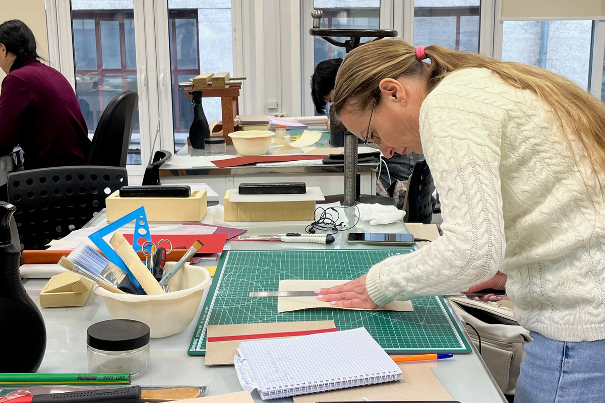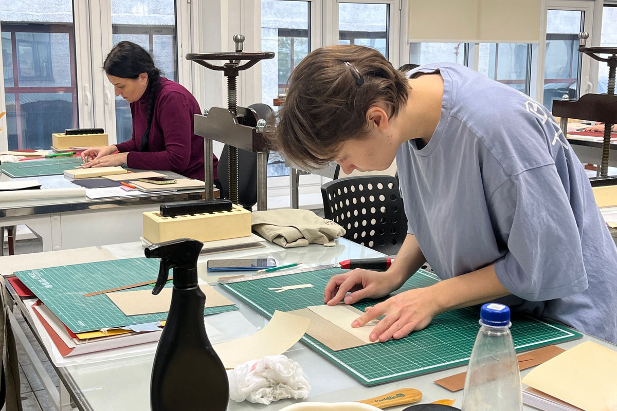 В течение двух недель обучающиеся занимались изготовлением разных видов переплёта: мягкого бумажного, твёрдого коленкорового и твёрдого составного на гильзе.