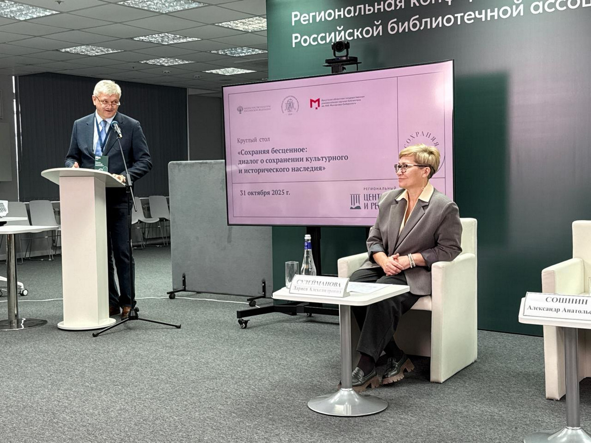 В рамках открытия РЦКР прошёл круглый стол «Сохраняя бесценное: диалог о сохранении культурного и исторического наследия». Спикерами выступили Лариса Сулейманова, директор ИОГУНБ; Анастасия Бакулина, директор Национальной библиотеки имени