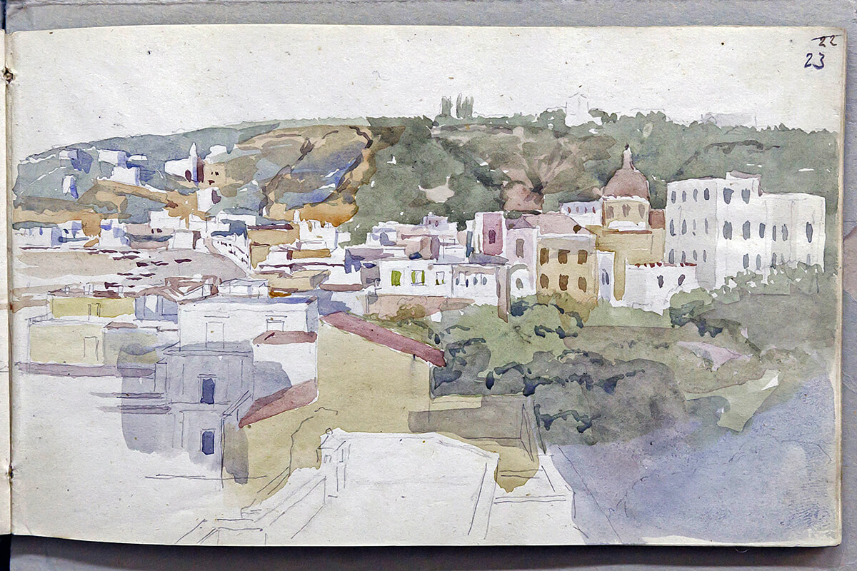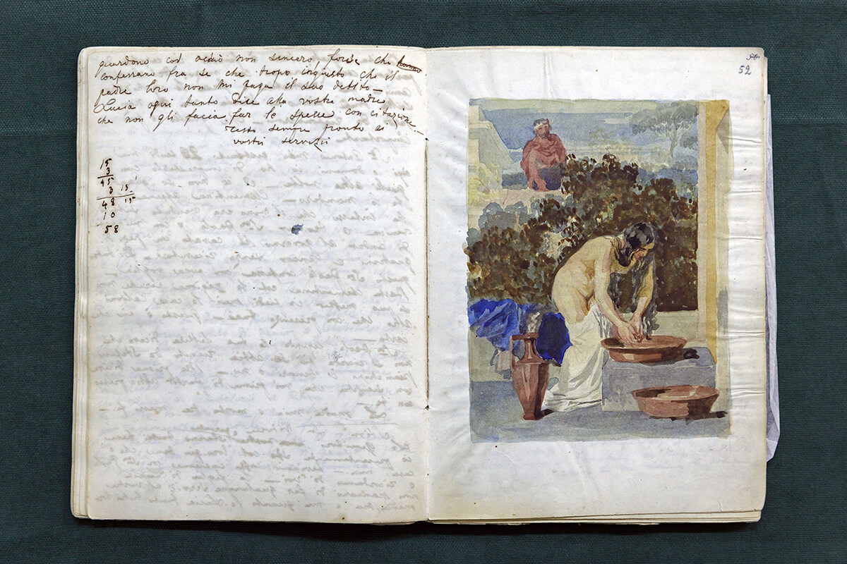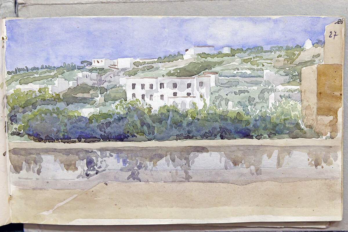 В записных книжках среди многочисленных рисунков выделяются три акварели. Одна из них — «Вирсавия» (илл.: к. 2, ед. 1, л. 52). Над этим библейским сюжетом работал друг Александра Иванова — художник Василий Алексеевич Серебряков. В одном из писем Александра Андреевича есть упоминание об этом. Тема «Вирсавии» прослеживается и в карандашных рисунках. Из многочисленных пейзажных зарисовок только два рисунка выполнены акварелью — виды городов Италии (илл.: к.2, ед. 2, л. 23, 27).