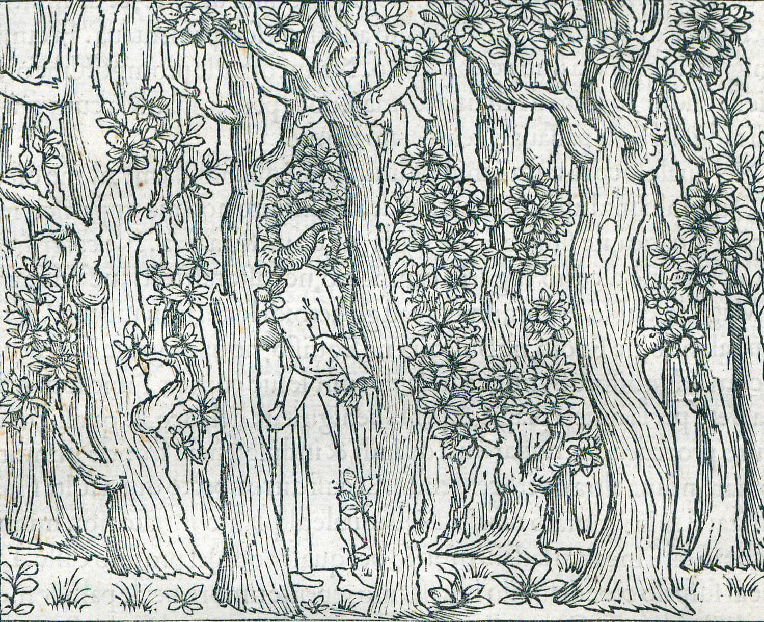 Полифил в лесу. Иллюстрация со страницы издания 1499 года типографии Альда Мануция, романа «Любовное борение во сне Полифила, в котором показывается, что все дела человеческие суть не что иное как сон, а также упоминаются многие другие, весьма достойные знания предметы» (Poliphili Hypnerotomachia, ubi humana omnia non nisi somnium esse docet, atque obiter plurima scitu sane quam digna commemorat)
