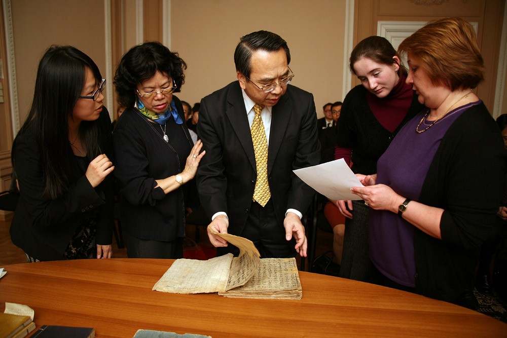 Немного из истории наших взаимоотношений. Во время своего рабочего визита на Тайвань в декабре 2010 года президент РГБ Виктор Федоров подписал соглашение о сотрудничестве РГБ с Национальной центральной библиотекой Китайской Республики. За этим в январе 2011 года последовал ответный визит главы Московско-Тайбэйской координационной комиссии по экономическому и культурному сотрудничеству Чэня Цзюньсяня ( Антонио Чэня), а в мае в нашей библиотеке побывал художественный руководитель Национального театра и концертного зала в Тайбэе Пи-тван Хуанг. 31 августа 2011 года к нам в гости приезжали сотрудники Национальной центральной библиотеки (National Central Library) во главе с генеральным директором Цэн Щусян.