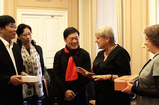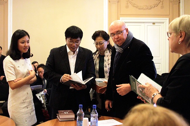 Гости также отметили, что готовы присылать в РГБ новые книги на китайском языке ежегодно. По итогам встречи было решено подготовить протокол о намерениях. Ответным даром от РГБ делегации из провинции Хубэй стали книга Людмилы Сараскиной «Граф Н. П. Румянцев и его время», двухтомник Татьяны Гребенюк «Владельческие книжные знаки в отделе редких книг РГБ» , «Каталог художественных переплетов собрания Карла Бехера» , «Каталог инкунабулов и палеотипов из собрания Генриха Клемма» , другие издания.