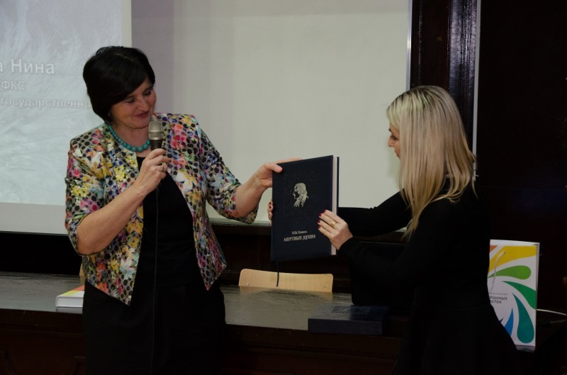 От име­ни РГБ Ни­на Ав­де­е­ва, на­чаль­ник УФКС РГБ, ру­ко­во­ди­тель про­ек­та ЭБД РГБ, при­вет­ство­ва­ла участ­ни­ков ме­ро­при­я­тия и пре­под­нес­ла в дар фи­ло­ло­ги­че­ско­му фа­куль­те­ту Бел­град­ско­го уни­вер­си­те­та по­да­роч­ное из­да­ние Н. В. Го­го­ля «Мерт­вые ду­ши». По­сле при­вет­ствен­ных слов Ни­на Ав­де­е­ва пред­ста­ви­ла до­клад и пре­зен­та­цию на те­му «Элек­трон­ные ре­сур­сы Рос­сий­ской го­су­дар­ствен­ной биб­лио­те­ки», а так­же рас­ска­за­ла о сов­мест­ном про­ек­те РГБ и фон­да «Рус­ский мир». По окон­ча­нии сво­е­го вы­ступ­ле­ния Ни­на Ав­де­е­ва от­ве­ти­ла на во­про­сы при­сут­ству­ю­щих го­стей.