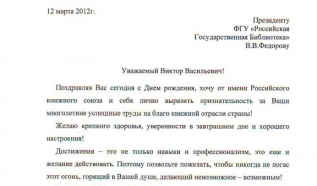 12 марта президенту РГБ Виктору Федорову исполняется 65. Пятнадцать лет он работает в библиотеке, новейшая история которой уже неотделима от его имени. Возрождение стоявшего в руинах Дома Пашкова, внедрение современных информационных технологий, сохранение профессиональных кадров, укрепление социальной защищенности сотрудников — вот далеко не полный перечень его заслуг. Библиотечный коллектив от всей души поздравляет Виктора Васильевича с юбилеем!