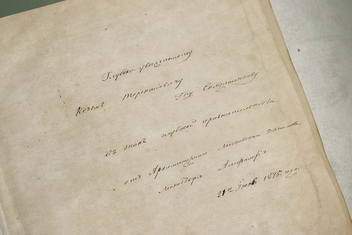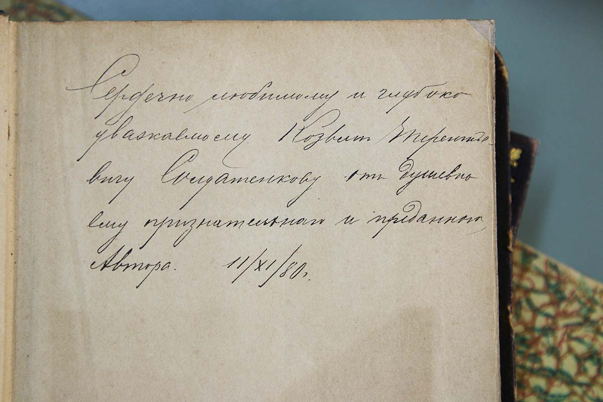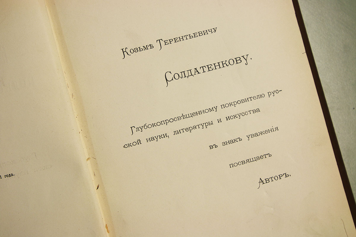 В Российской государственной библиотеке хранится около 8000 книг Козьмы Терентьевича Солдатёнкова. Это богатая коллекция изданий в дорогих и красивых переплётах. Дарственные надписи на книгах невозможно читать без волнения: «Глубокоуважаемому Козьме Терентьевичу в знак глубокой признательности», «Сердечно любимому Козьме Терентьевичу на долгую память», «Меценату Солдатёнкову с благоговейным трепетом»...