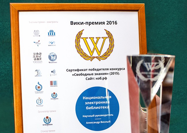 Национальная электронная библиотека (НЭБ), оператором которой является Российская государственная библиотека, стала лауреатом Вики-премии — 2016 в номинации «Свободные знания».