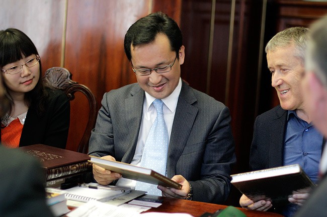 Поводом для встречи стало 65-летие образования КНР и обмен книгами между посольством, библиотекой и издательствами. РГБ и посольство Китая получили переведенную на китайский «Шанхайским народным издательством» биографию Сталина, написанную Святославом Рыбасом. Гостям из посольства также преподнесли несколько изданий «Молодой гвардии», «Русского слова» и «Пашкова дома», связанных с культурой Китая. С самого образования Китайской Народной Республики в 1949 году РГБ сотрудничает с ее многочисленными библиотеками: с Национальной библиотекой в Пекине, книгохранилищами в Шанхае, Харбине и многих других городах. Но еще задолго до начала этого сотрудничества книги на китайском стали украшением восточных фондов РГБ. Среди целостных коллекций в Центре восточной литературы особое место принадлежит собранию российского дипломата и синолога Константина Андриановича Скачкова. Оно имеет огромную научную и культурную ценность, насчитывает около 12 тысяч рукописей и ксилографических изданий на китайском и маньчжурском языке.