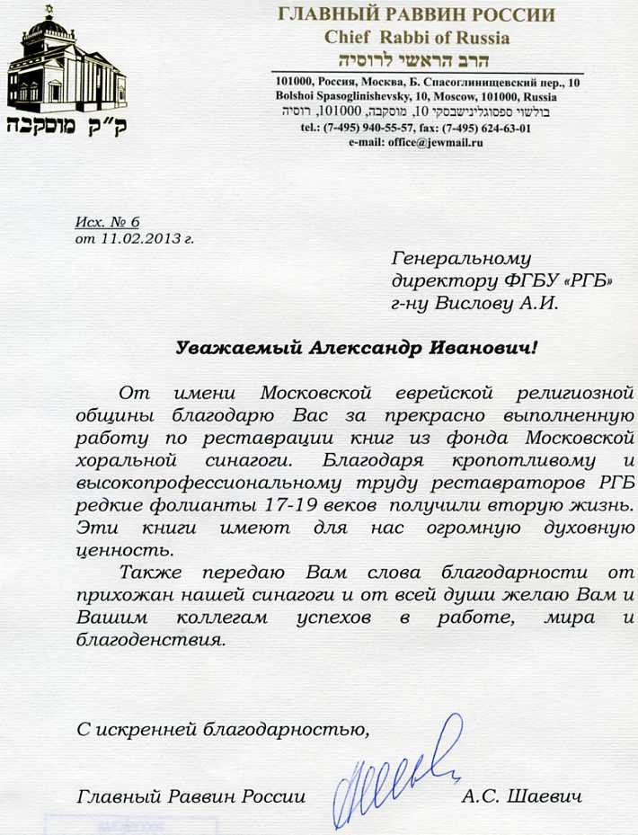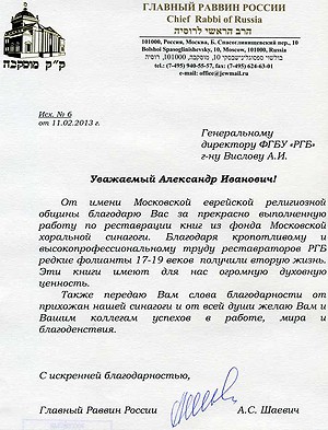 Профессионализм реставраторов РГБ давно проверен временем: через их руки прошли тысячи изданий на бумаге и пергамене, сотни рукописей, изоматериалов и газет. Недавно он был в очередной раз подтвержден письмом, которое получено библиотекой от Московской еврейской религиозной общины.