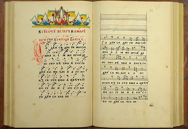 Разворот книги Владимира Одоевского «Октоих двузнаменный (на крюковых и линейных нотах)»
