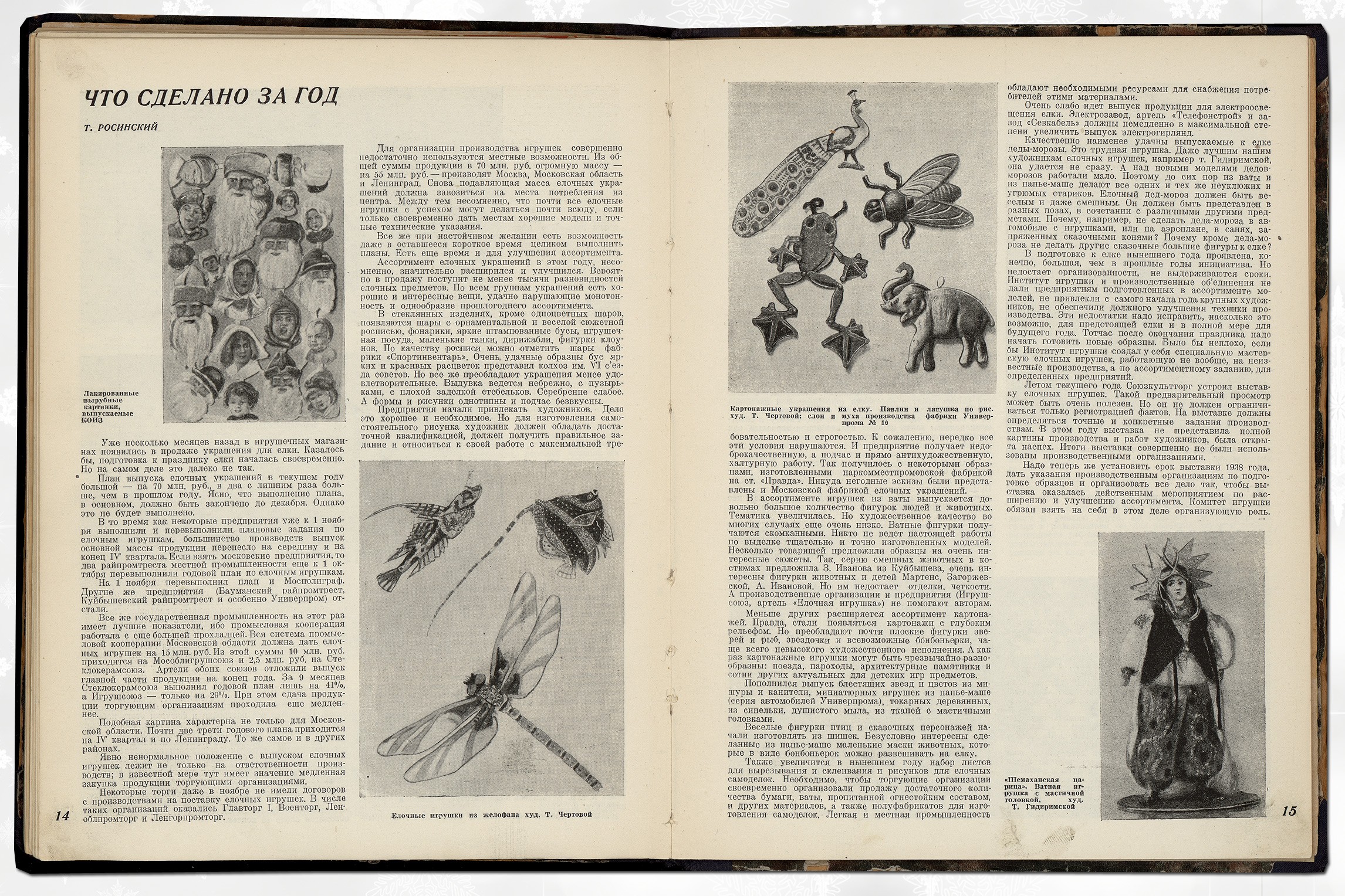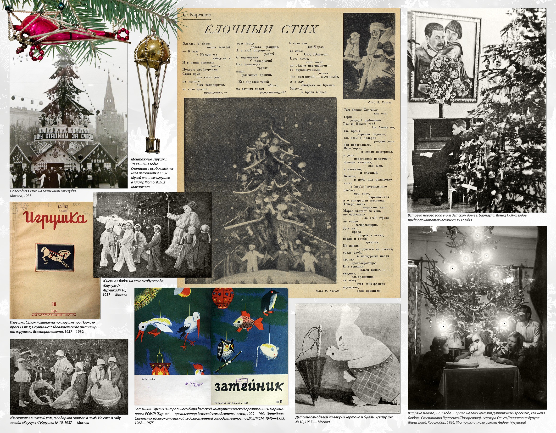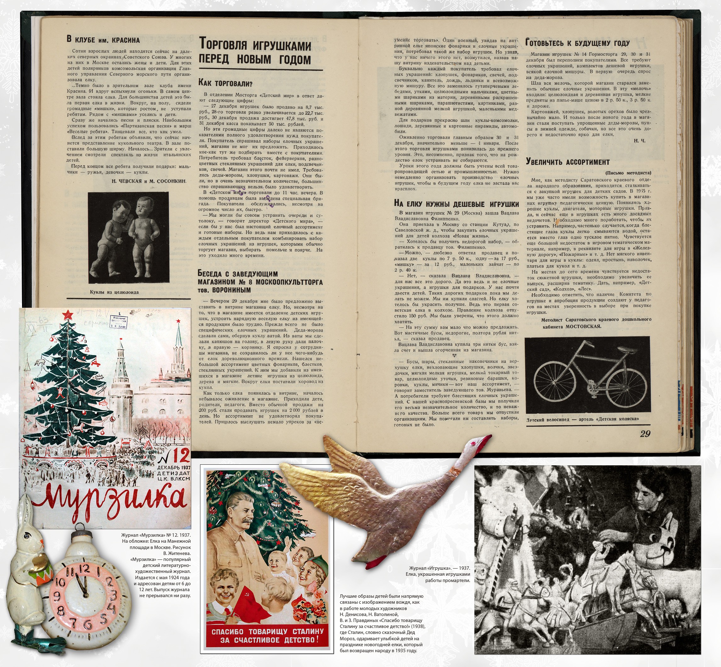 Уже в 1936 году полным ходом шло настоящее коммунистическое ёлочное строительство. Был создан Наркомпрос комитет по игрушке, который в том же году выпустил серьёзный сборник статей «Ёлка». «Ёлки 1935 и 1936 года различны, — анализирует автор статьи "Ёлка в детском саду". — В 1935 году ёлка была устроена почти экспромтом... Организация ёлки в 1936 году заранее обсуждалась, были учтены ошибки проведения ёлки 1935 года. На совещании в Наркомпросе были поставлены и обсуждены вопросы: значение ёлки для ребят; нужно ли делать ёлку сюрпризом для детей или они должны знать об её организации; по окончании праздника убирать ли ёлку или оставлять...» Новогодние выпуски всех журналов не обошлись без изображения зелёного мохнатого дерева на обложке. Декабрьский номер журнала «Мурзилка» за 1937 год открывается историей о том, как Мурзилка озаботился отсутствием ёлки у полярников Папанина и Кренкеля на Северном полюсе. «Я изобрёл прессованную ёлку, ёлку-консервы, — ликует он. — Её надо воткнуть в снег, полить — и через пять минут вырастает новогодняя ёлка со всеми украшениями, свечами и музыкой». Стали издаваться специализированные издания, посвящённые исключительно игрушкам и ёлочным украшениям. В 1936 году вышел первый номер журнала «Советская игрушка» (с 1937 года — «Игрушка»), который со всей серьёзностью освещал вопросы новогоднего игрушечного производства и торговли. И если в 1936 году он рассказывал в основном о драматических случаях превышения спроса над предложением («Нужно немедленно организовать производство ёлочных игрушек, чтобы в будущем году ёлка не застала нас врасплох»), то в 1939 году здесь уже пишут, что «планы продажи ёлочных украшений перевыполнены», а подготовка к игрушечной торговле начинается уже в августе. Не обходится и без критики: «Имея все возможности к расширению ассортимента и улучшению качества стеклянных ёлочных украшений, Жилинская фабрика и завод "Лаборприбор" успокоились на успехах позапрошлого года».