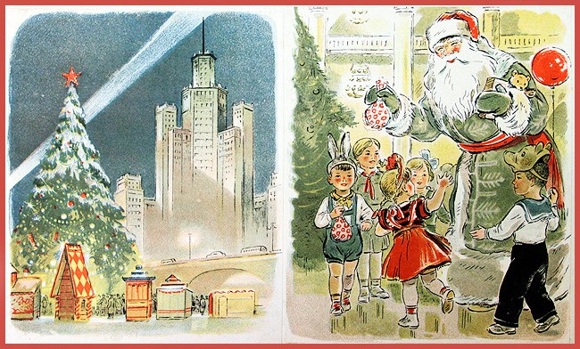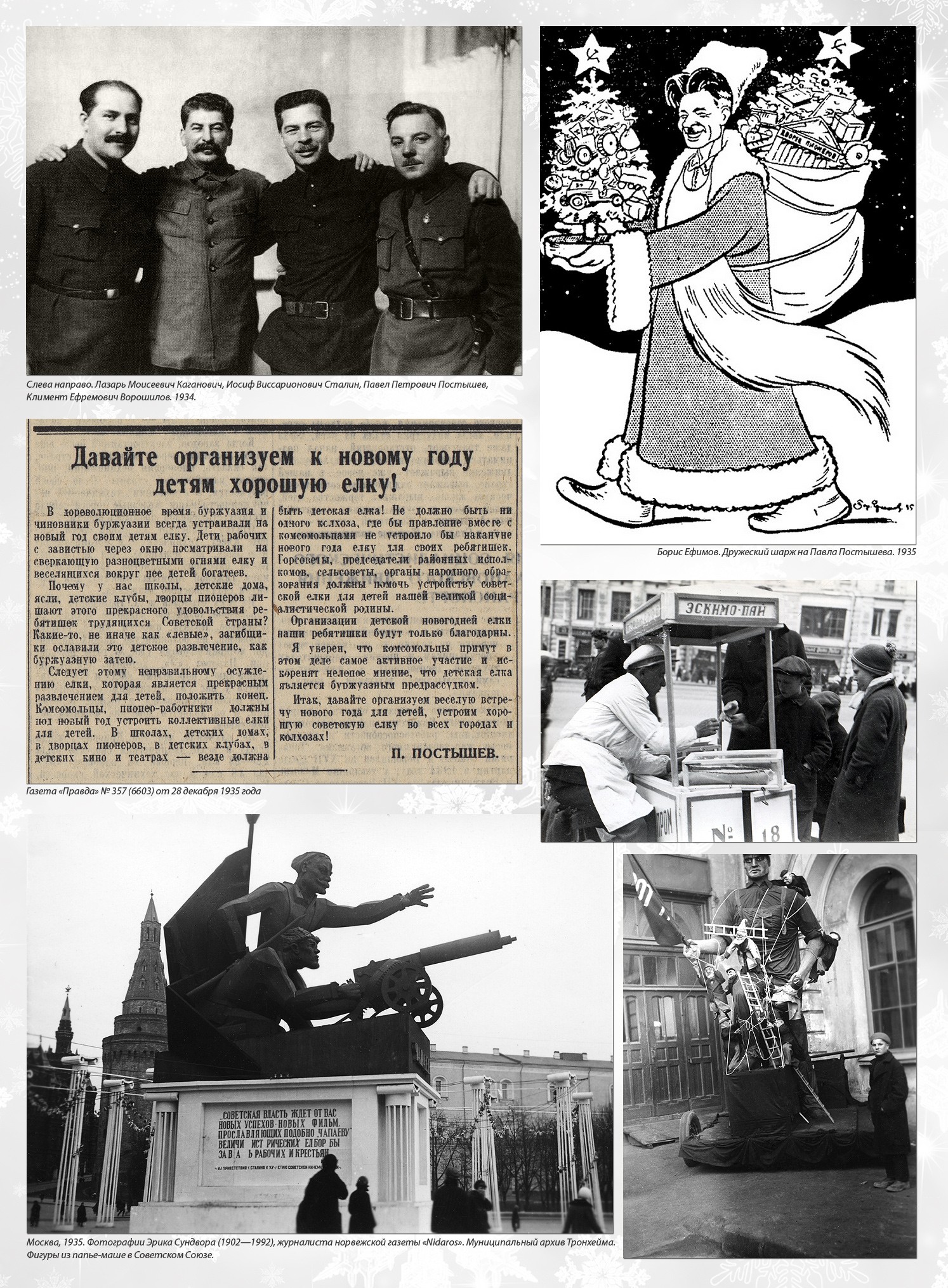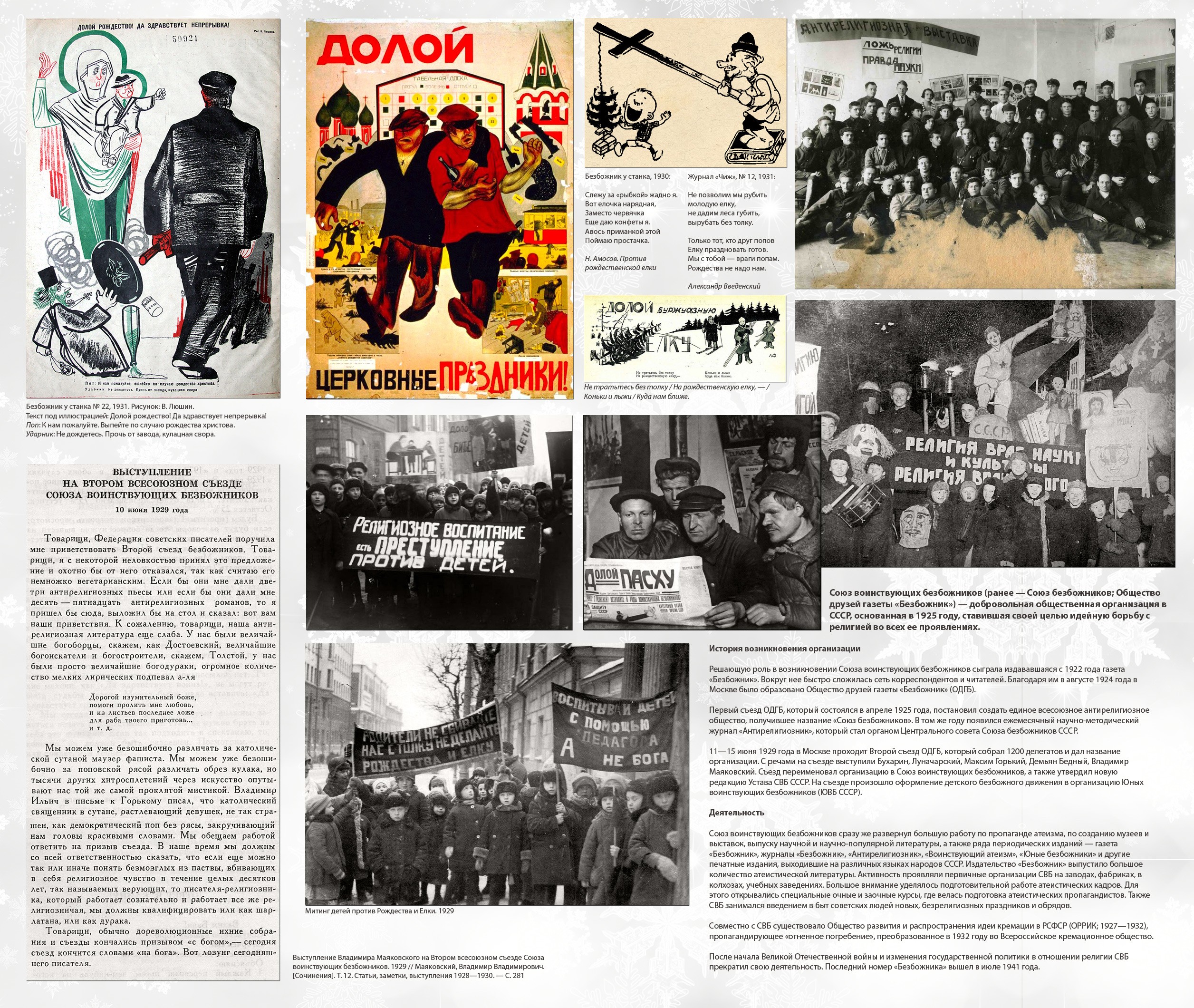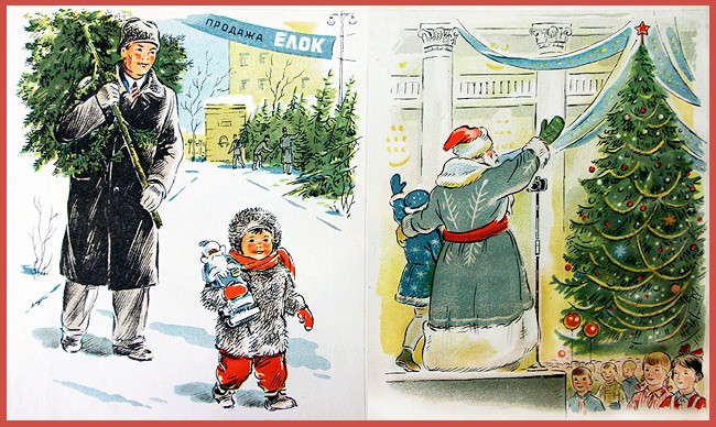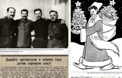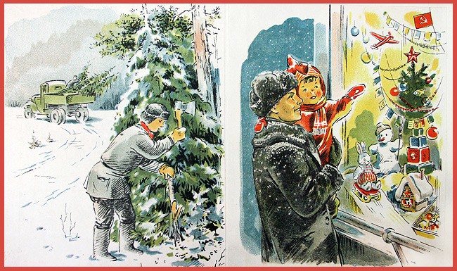 «Только тот, кто друг попов, ёлку праздновать готов» В 1927 году началась систематическая антирелигиозная работа. Вместе с Рождеством отменялась и ёлка, которая стала называться поповским обычаем. Журнал «Безбожник у станка» (№ 12, 1928) видит особенную опасность, исходящую от неё: заметка «Прочность предрассудка» разоблачает всех, кто ставит ёлку, заявляя, что она не связана с религией, а всего лишь дань традиции. «Рождественская ёлка — это фетиш. Выбросив иконы за окно, мы прячем бога за ёлку. С этим позорным явлением необходимо кончать. Конечно, нет и не должно быть места ни ёлке, ни рождественским подаркам». В следующем году тот же «Безбожник у станка» продолжает борьбу с ёлкой, вспоминая плакат, на котором изображён «сектант», стоящий на «священных книгах» и держащий в руках крест, который он использует как удилище. Леска заканчивается крючком, скрытым в рождественской ёлке, на которую зачарованно смотрит мальчуган, протягивая к ней руки, в то время как коварный сектант думает: «Слежу за рыбкой жадно я. / Вот ёлочка нарядная, / Заместо червячка. / Ещё даю конфеты я. / Авось, приманкой этой / Поймаю простачка».