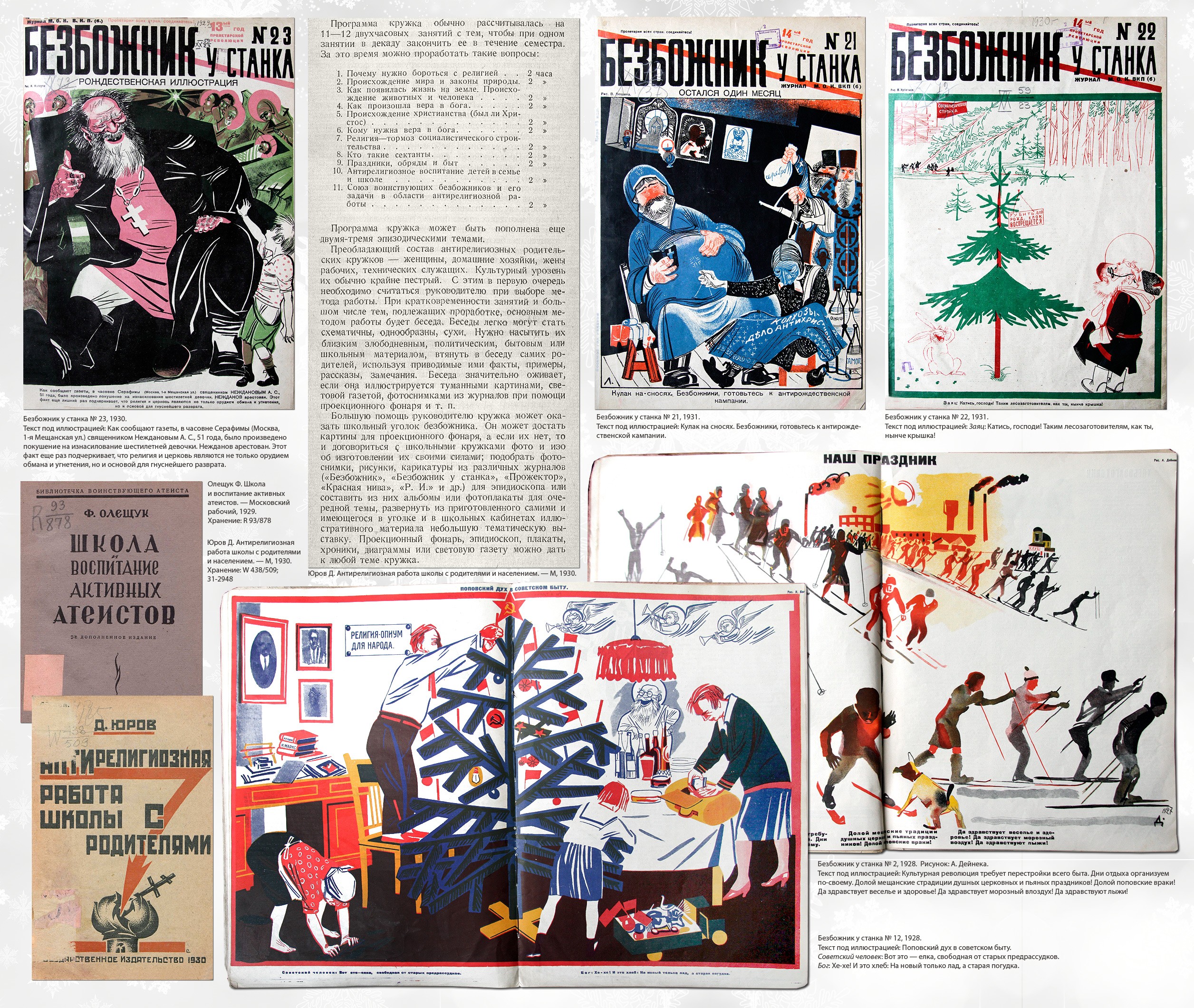 Подобного рода плакаты стали обычными для газеты «Пионерская правда» и детских журналов тех лет. Предновогодними вечерами по улицам ходили дежурные и вглядывались в окна квартир: не светятся ли где-нибудь огни ёлок. В школах стали проводиться «антирождественские вечера», на которых инсценировались пьески, высмеивающие попов и церковь. «Религиозность ребёнка начинается именно с ёлки, которая, заполняя собой всё его существо, заражает религиозным настроением, верой в таинственные силы. Ребёнок отравляется религиозным ядом и получает неверное представление об окружающем мире, что в дальнейшем затрудняет его учёбу и работу», — сообщает брошюра Николая Константиновича Амосова «Против рождественской ёлки» («Безбожник», 1930). Характерно, что борьба с религиозным обычаем соединилась с кампанией по защите леса. Журнал «Искорка» (№ 12, 1928) цитирует юных натуралистов Московской биостанции: «На "рождество" хотят все, чтобы у них была ёлка. А нас, детей, так много, что из-за этого нехорошего праздника срубаются целые миллионы молодых ёлок и сосенок. А разве это хорошо? Будем бережливо относиться к лесу и не устраивать рождественских ёлок. Можно и без них хорошо повеселиться». В 1931 году ленинградский детский журнал «Чиж» поместил стихотворение Александра Ивановича Введенского: «Не позволим мы рубить / молодую ёлку, / не дадим леса губить, / вырубать без толку. / Только тот, кто друг попов, / Ёлку праздновать готов! / Мы с тобой — враги попам, / Рождества не надо нам». В результате ёлка «ушла в подполье»: в семьях, верных дореволюционным традициям, её продолжали устраивать, занавешивая окна одеялами. Писательница Ирина Петровна Токмакова вспоминает: «Светлый праздник Рождества Христова был под запретом, но наша мама, выросшая ещё до революции, не сказать, чтобы уж очень религиозный человек, однако чтящий традицию, наша мама ни разу не оставила нас с сестрой без рождественской ёлки». Если у воспитателей хватало смелости, праздники ёлки устраивали даже в детских садах. Писательница Мариэтта Омаровна Чудакова рассказывала, что её мать, работавшая в 1930-х годах в детском саду, ни разу не оставила своих воспитанников без ёлки.