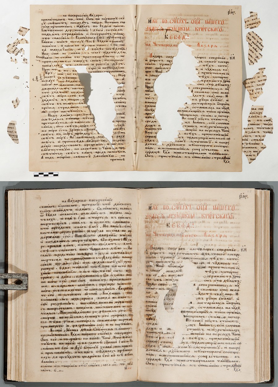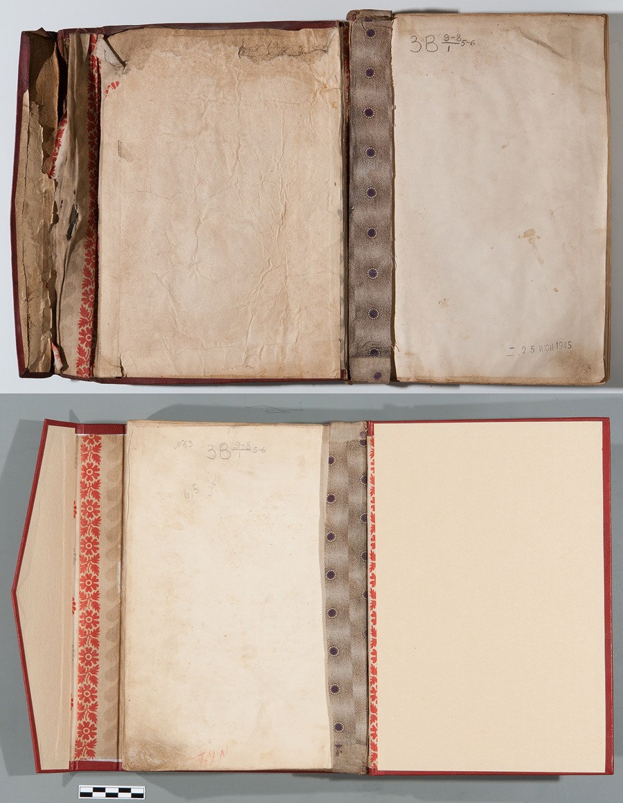 Процесс реставрации сложен и долог: книгу надо очистить от поверхностных загрязнений, разброшюровать книжный блок, удалить предыдущий клей с корешка тетрадей. При необходимости специалисты подберут реставрационную бумагу, схожую с оригиналом по фактуре, цвету и толщине, укрепят красочный слой книжных миниатюр.