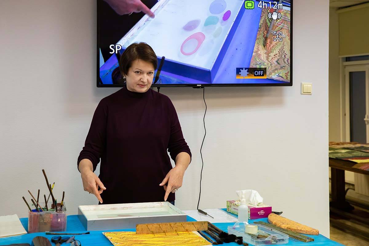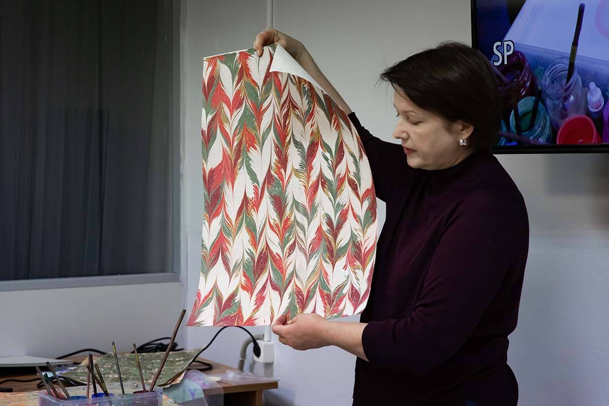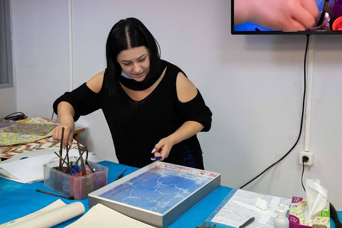 В программу обучения входили также мастер-классы. Большой интерес у слушателей вызвал мастер-класс по изготовлению мраморной бумаги, который провела Елена Белозёрова.