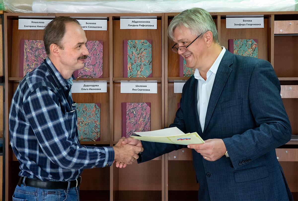 Последней группе выпускников удостоверения вручил генеральный директор Российской государственной библиотеки Вадим Дуда. Он отметил, что только в крупных библиотеках нашей страны требуют реставрации более 9 миллионов документов. «Наша общая забота — чтобы вопрос реставрации, консервации и сохранности фонда стал государственным делом», — подчеркнул Вадим Дуда.