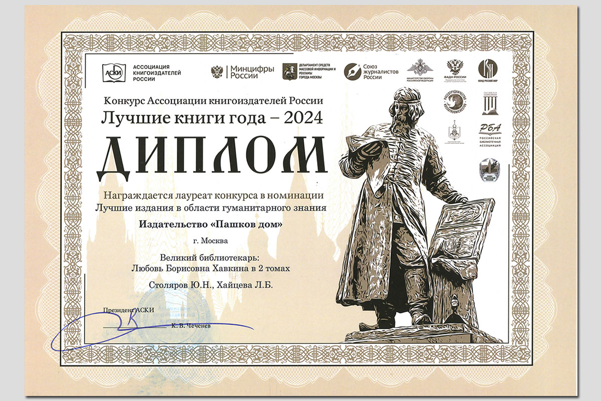 В номинации «Лучшие издания в области гуманитарного знания» лауреатом конкурса стал двухтомник «Великий библиотекарь Любовь Борисовна Хавкина», рассказывающий о личности и деятельности выдающегося библиотечного деятеля, основоположника регулярного библиотечного образования в России.