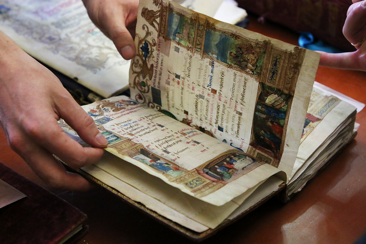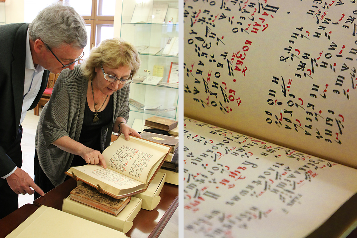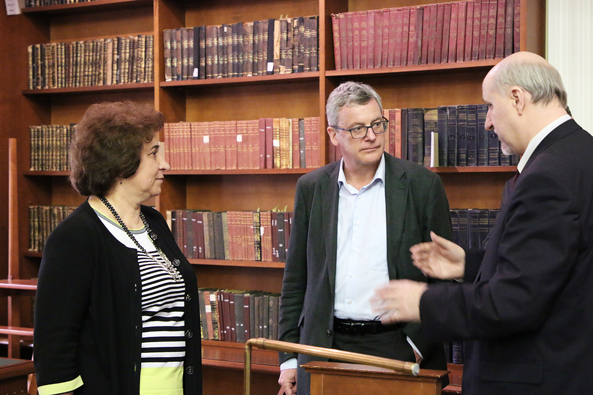 Наталья Юрьевна Самойленко, заместитель генерального директора по внешним связям и выставочной деятельности, провела для гостей экскурсию по Дому Пашкова, познакомила с историей библиотеки, рассказала о её сегодняшнем дне и о планах на будущее. В отделе рукописей Виктор Фёдорович Молчанов, заведующий отделом, и его коллеги подготовили сюрприз: гостям продемонстрировали подлинные сокровища из фондов РГБ: Архангельское Евангелие, Евангелие Хитрово, Псалтырь Ивана Грозного, Иллюминированный часослов, созданный во Франции в XVI веке и другие раритеты.