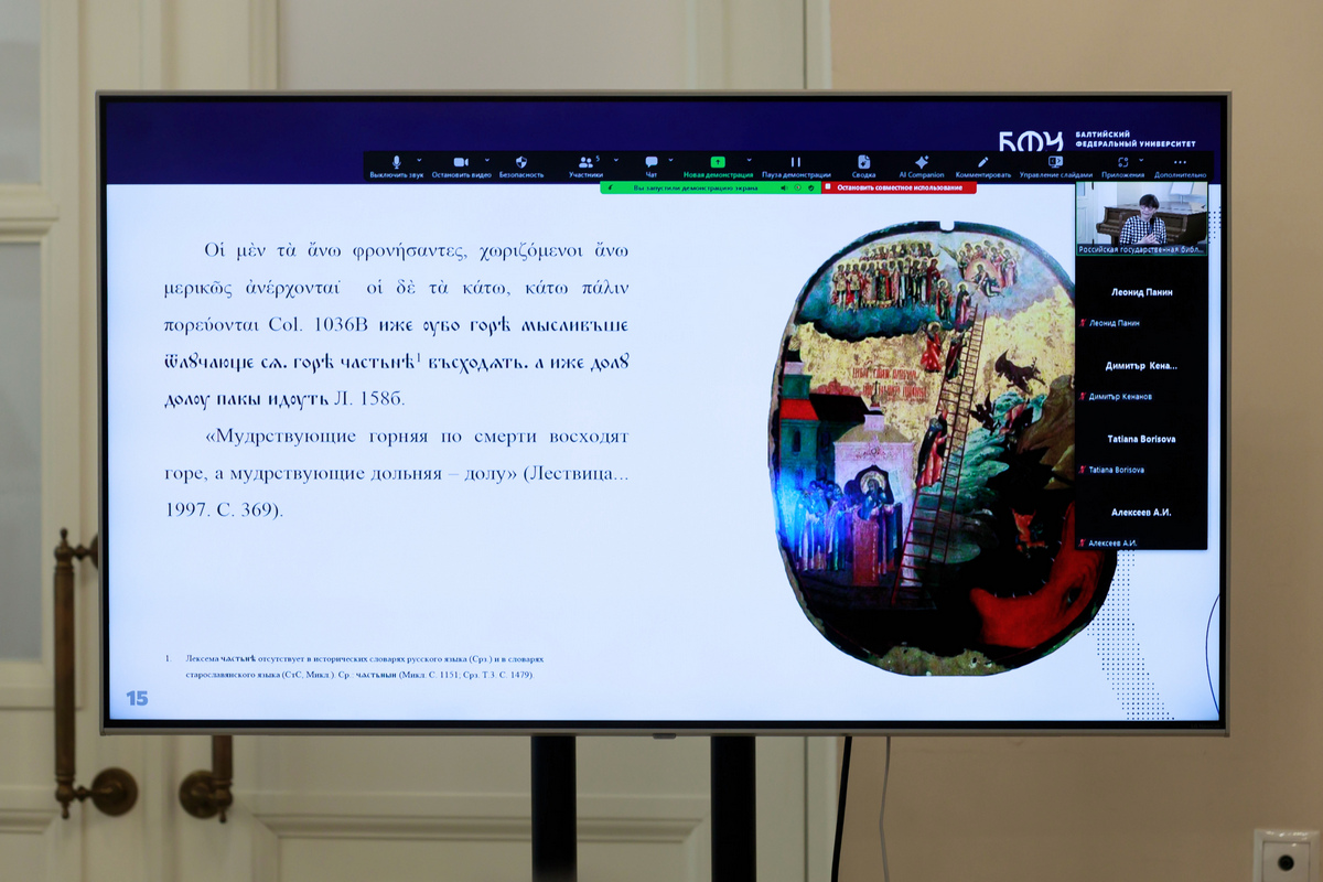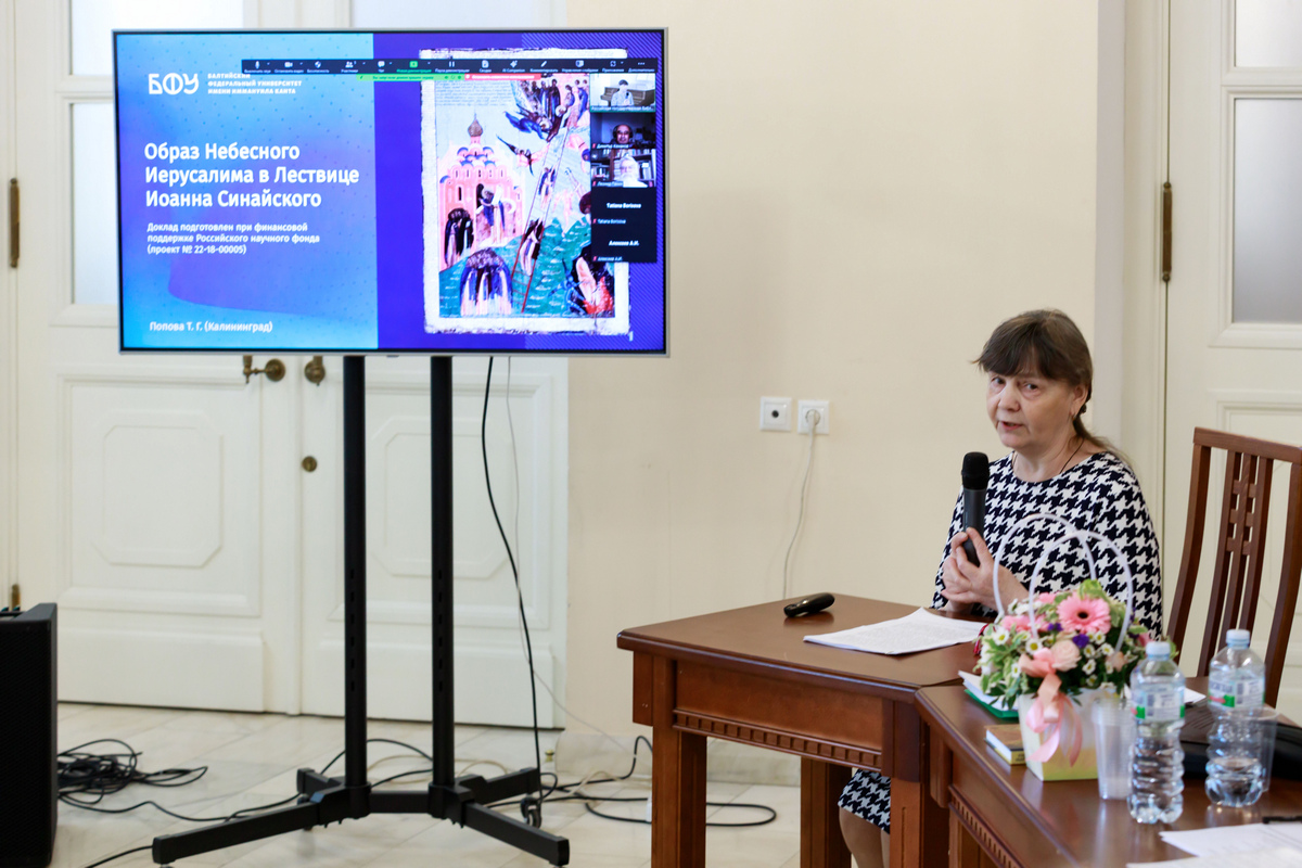 Татьяна Попова выступает с докладом «Образ Небесного Иерусалима в „Лествице“ Иоанна Синайского»