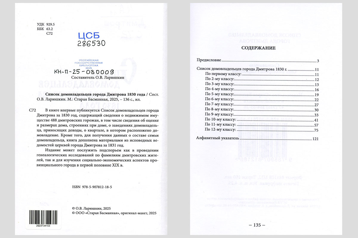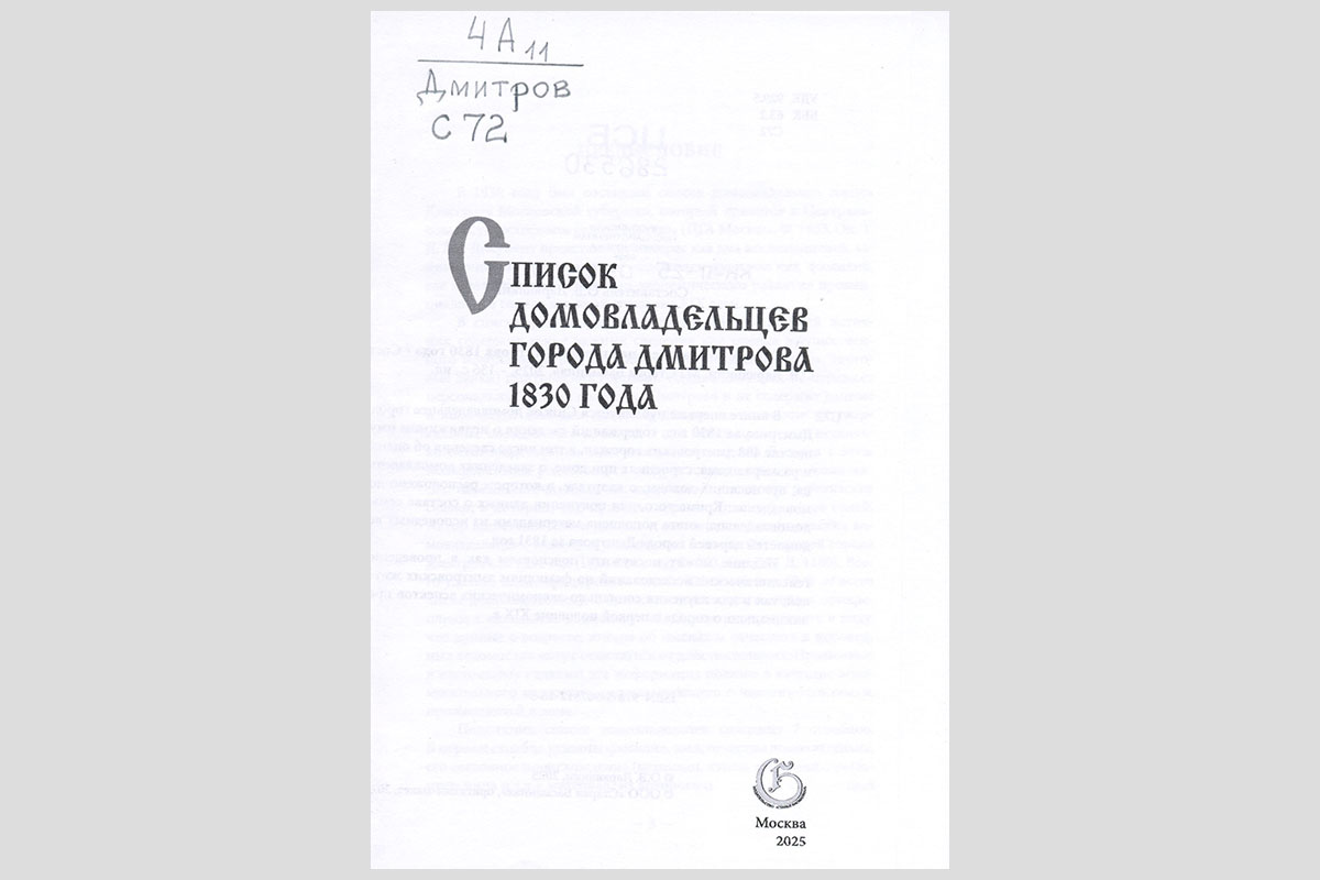 Список домовладельцев города Дмитрова 1830 года. Москва, 2025