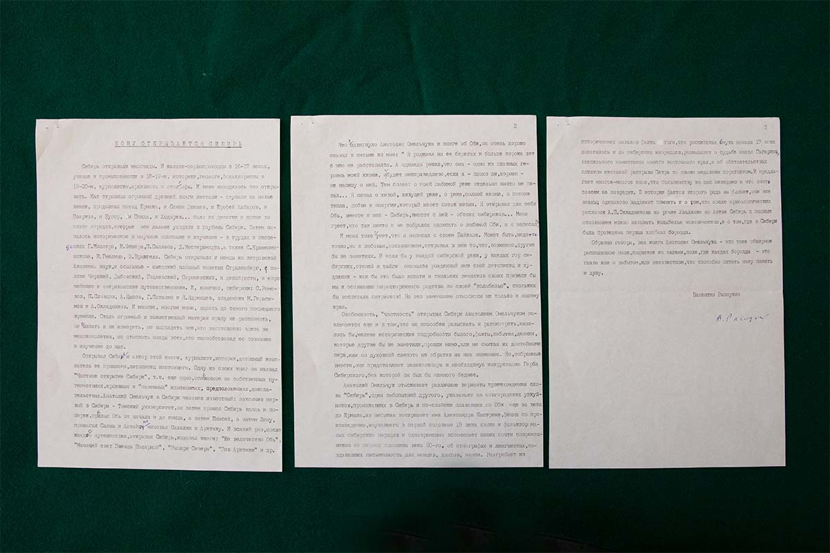 Среди документов, переданных Анатолием Константиновичем, два письма известного писателя Валентина Григорьевича Распутина Анатолию Омельчуку (2005, 2009), машинописные страницы предисловия Валентина Распутина «Кому открывается Сибирь» к книге Анатолия Омельчука «Её Величество Обь» с исправлениями и подписью-автографом (2005), радиоинтервью «Разговор с Валентином Григорьевичем Распутиным» на двух флешкартах в деревянных футлярах (2014), «Книгу Сибири» Анатолия Омельчука на двух флешкартах и, наконец, уникальную «Книгу слов» (2020, 7 лл.).