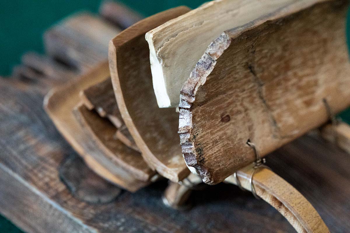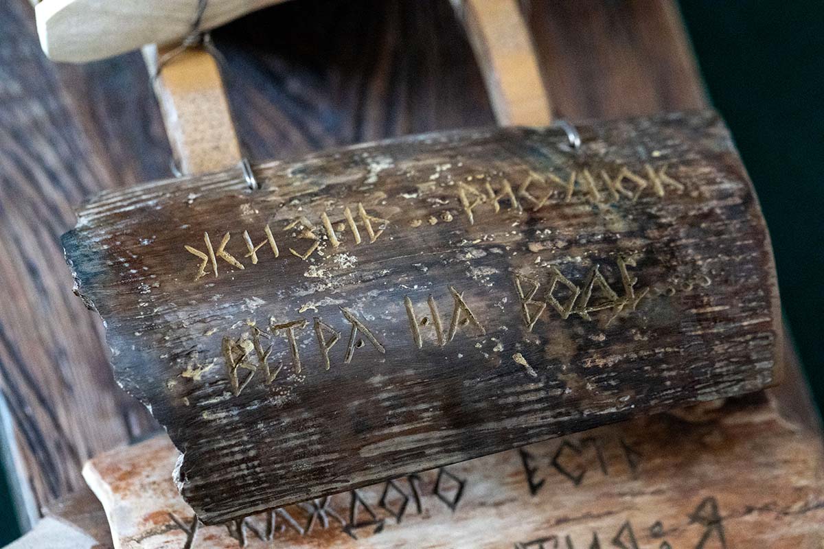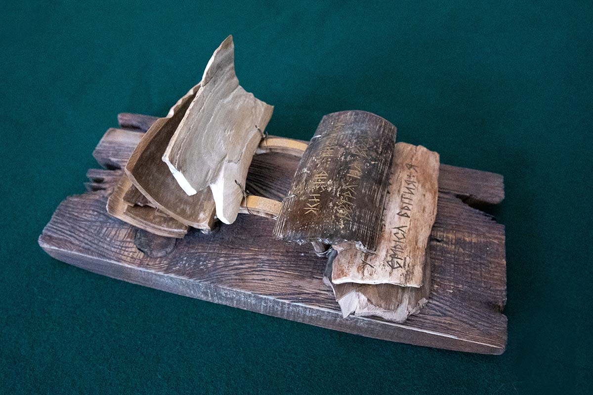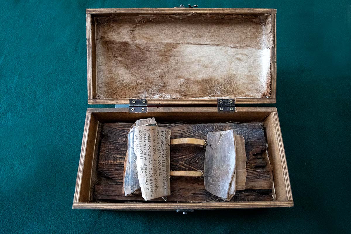 Костяные пластины с текстом крепятся к деревянной основе с помощью колец из мельхиоровой проволоки, надетых на бамбуковые скобы. Для изготовления книги на кости потребовалось решить множество задач, таких как распилка клыка на тонкие пластины, их обработка, нанесение текста, сшивка вместе. Мастер работал вместе с сыном Сергеем.
