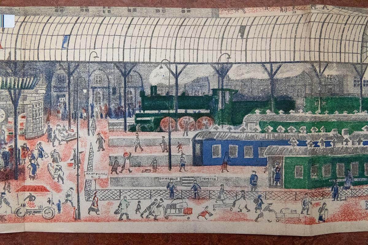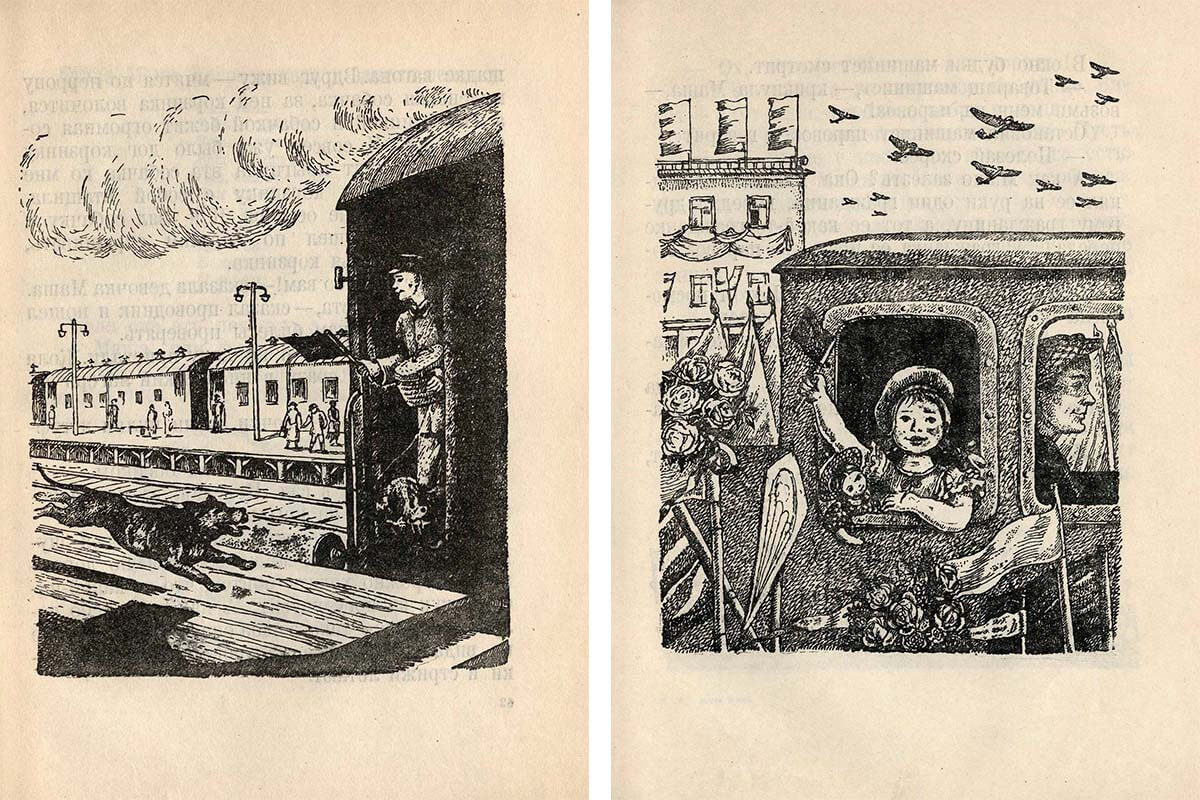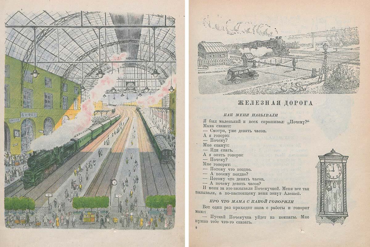 В заключение давайте полистаем книгу «Что я видел» , написанную Борисом Житковым и проиллюстрированную Еленой Васильевной. На первой же странице автор пишет, что этой книги должно хватить на год, она для неторопливого чтения: «Прошу вас, не читайте помногу!» И это очень правильно. Каждую страницу хочется разглядывать. Путешествовать вместе с Алёшей-Почемучкой по железной дороге, видеть, какие разные бывают вагоны и поезда, узнавать Москву, смотреть на животных в зоопарке, знакомиться с новыми взрослыми и детьми.