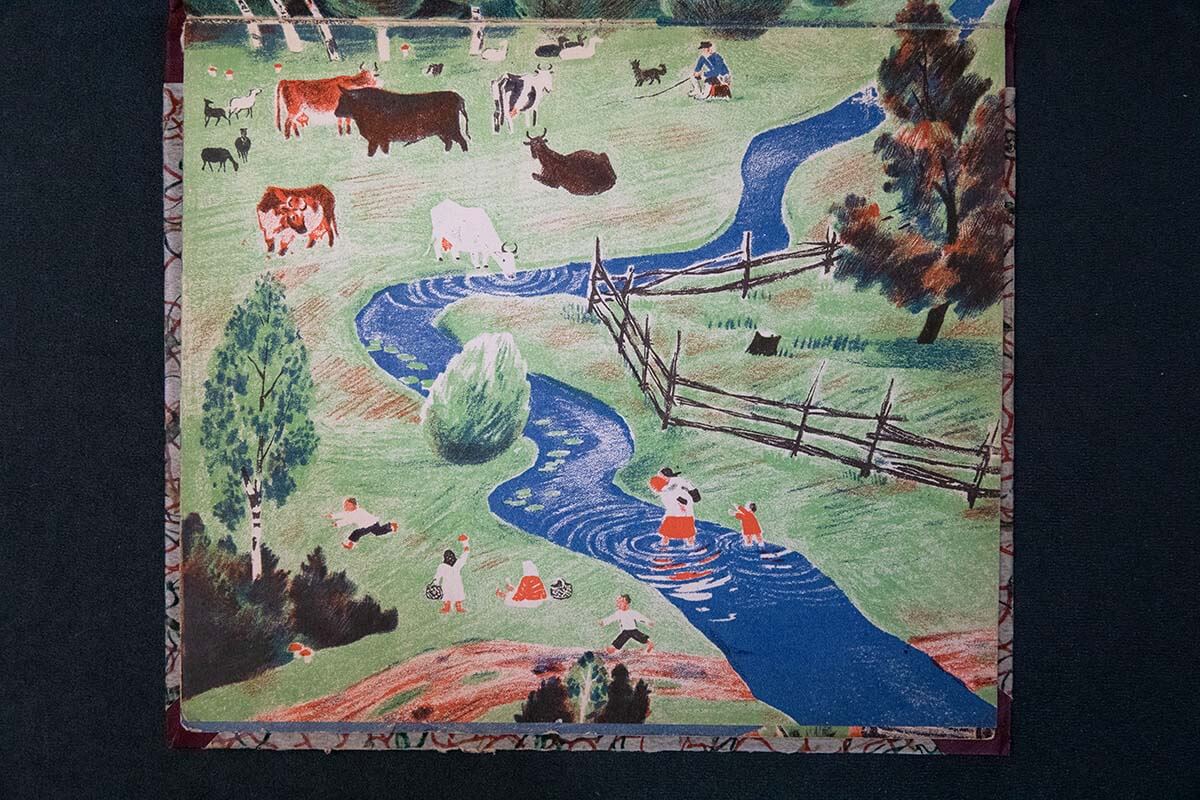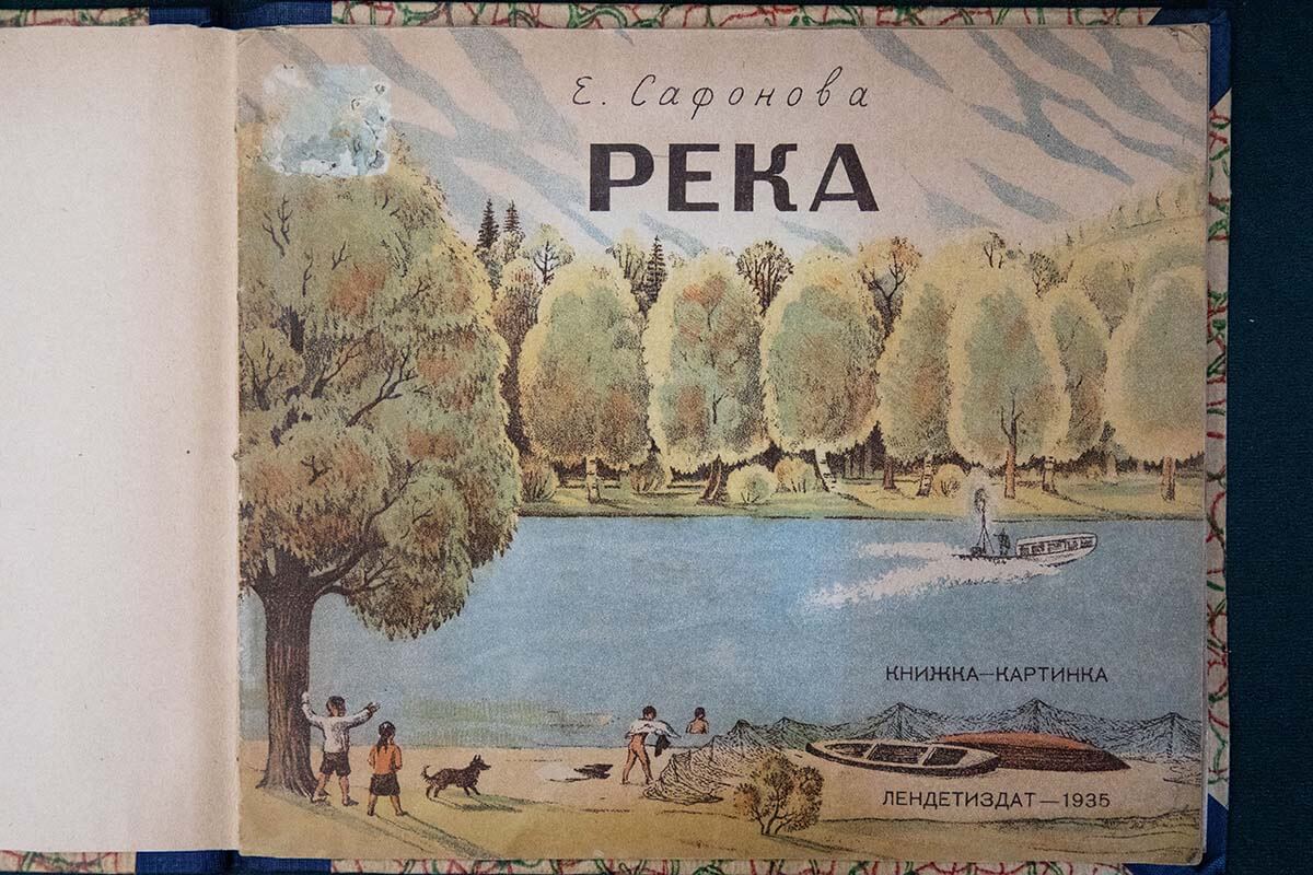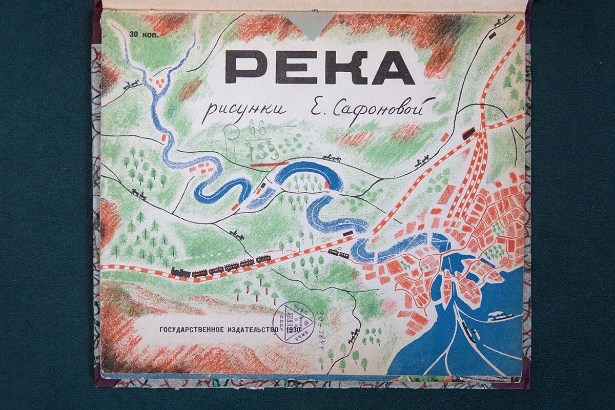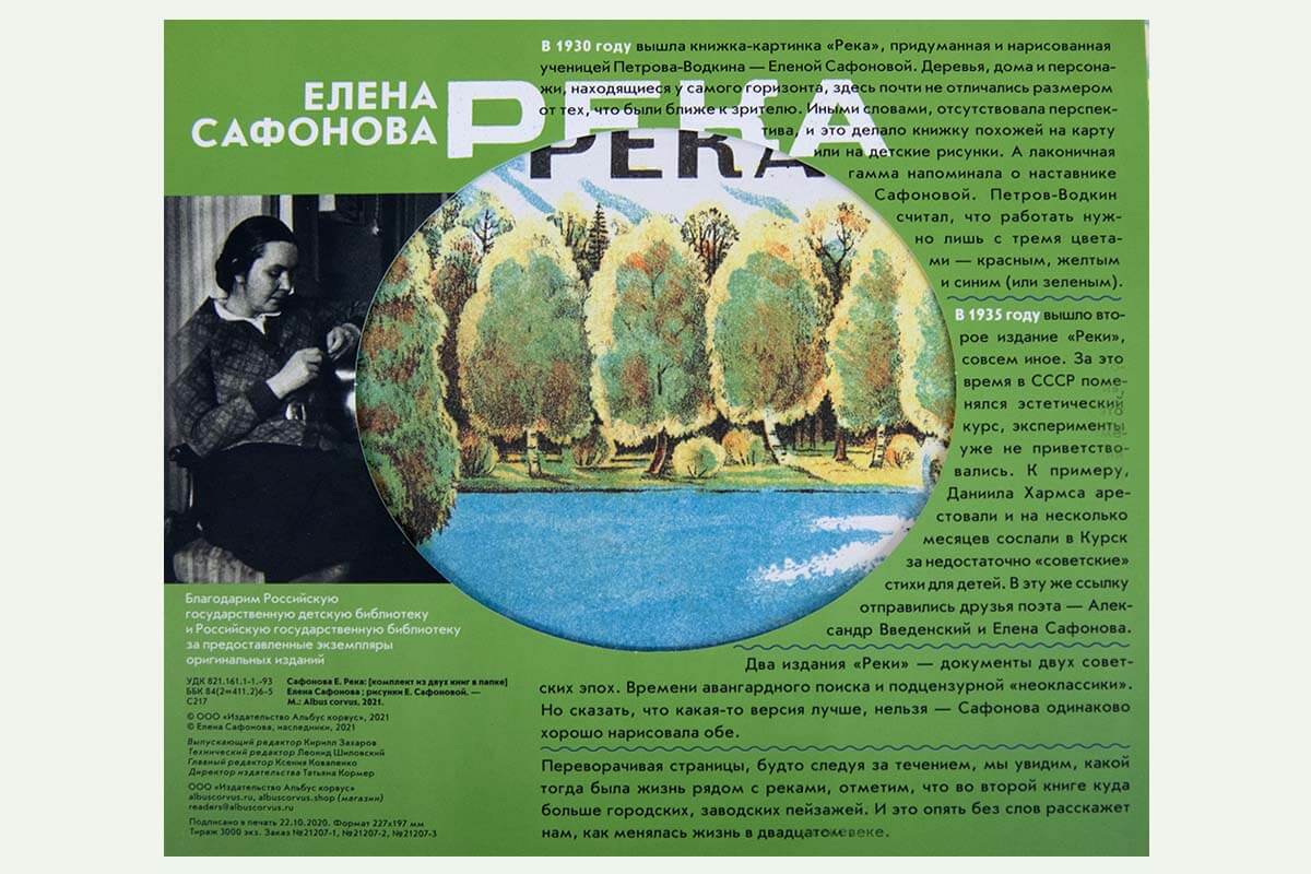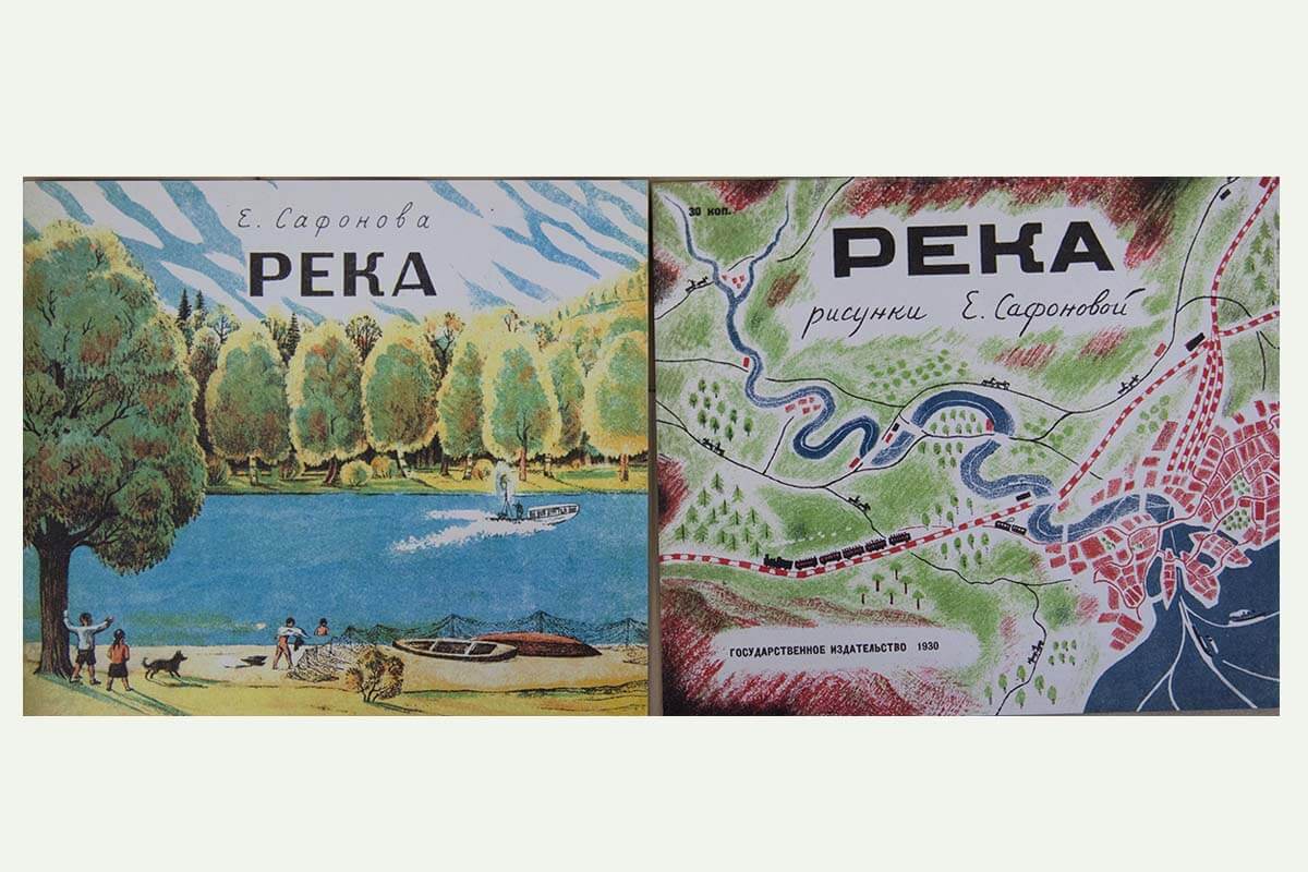 Интересна судьба книги «Река». Она целиком сделана Еленой Сафоновой. В этой книжке нет никакого текста — зато на разворотах в мельчайших подробностях изображена жизнь реки и людей рядом. Это книга-путешествие. От истока, где река узкая, на её берегах появляются небольшие деревни и женщины, стирающие бельё, — до полноводной реки с мостами и кораблями.
