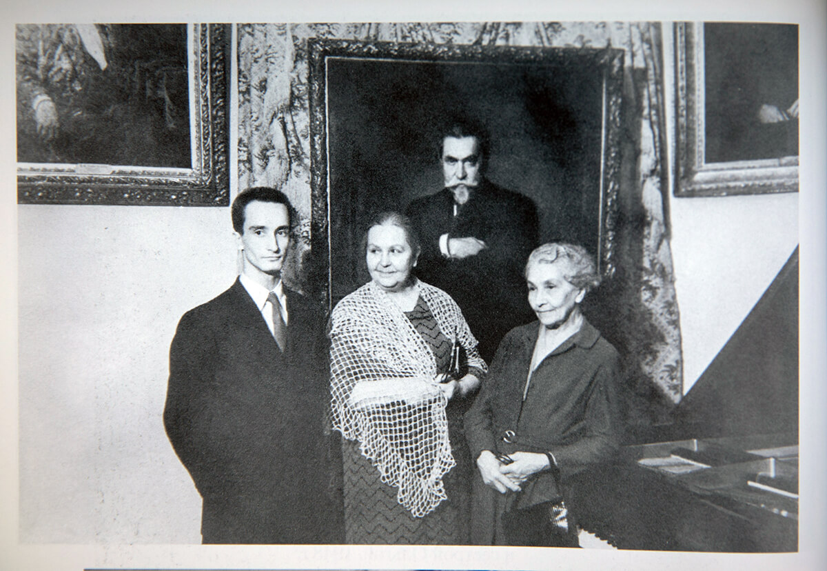 Илья Кириллович Сафонов с тётушками Еленой Васильевной Сафоновой и Анной Васильевной Книпер-Тимирёвой на вечере памяти его деда В. И. Сафонова в Московской консерватории. 1959. Фото из книги