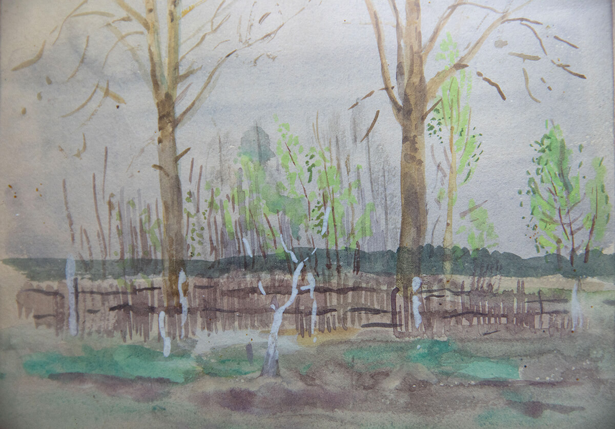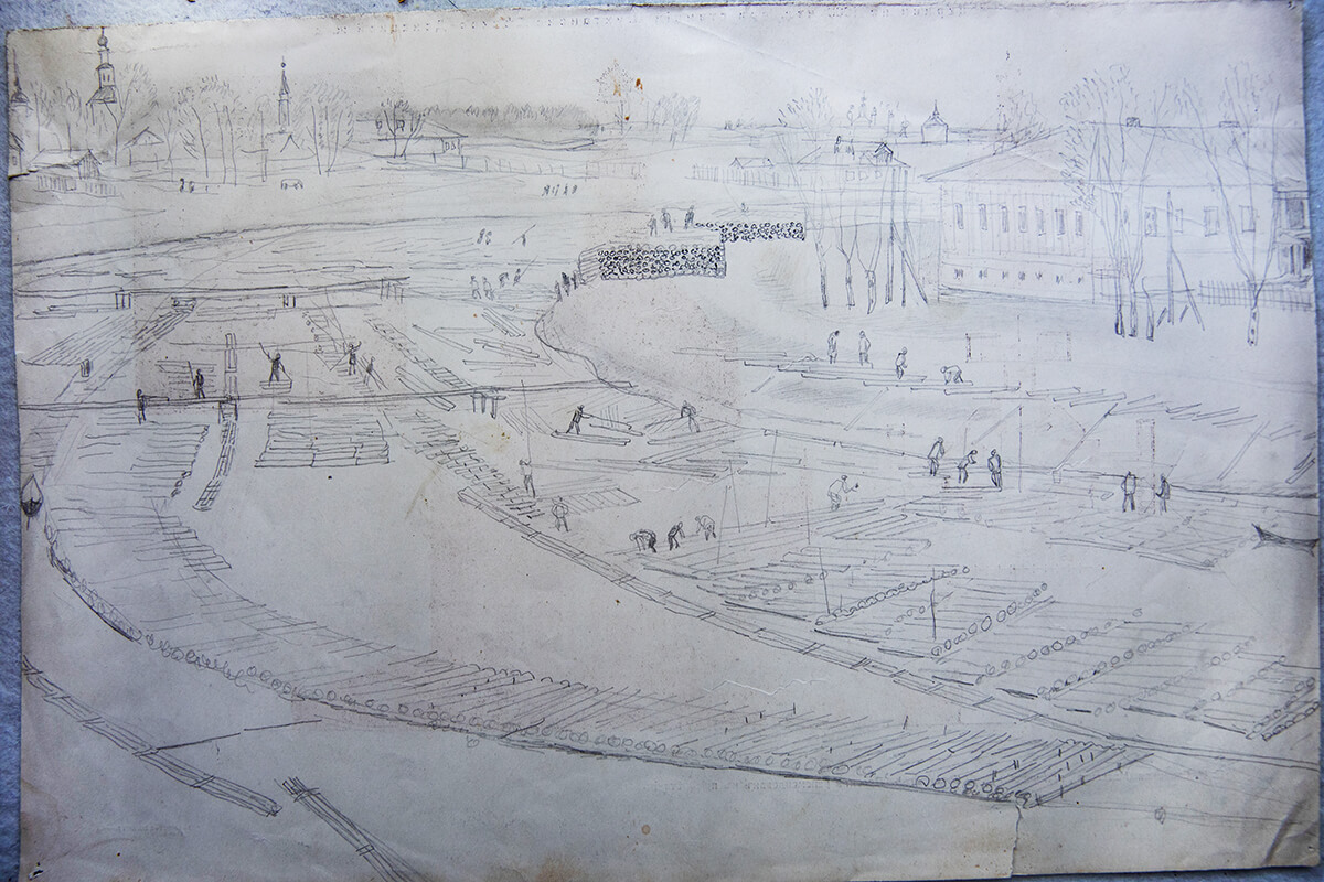 Ранние рисунки Елены Сафоновой не сохранились — они погибли в блокаду. Но зато мы можем видеть более поздние её работы, не связанные с детской иллюстрацией. Это пейзажи, натюрморты, наброски, эскизы. Один такой набросок бережно хранится в частной коллекции Владимира Севрюгина. Не отголосок ли это «Реки» и одновременно иллюстрация к путешествию Алёши-Почемучки? Во всех подробностях мы можем разглядеть строительство на реке, дома, церкви и деревья.