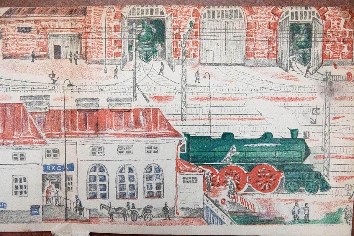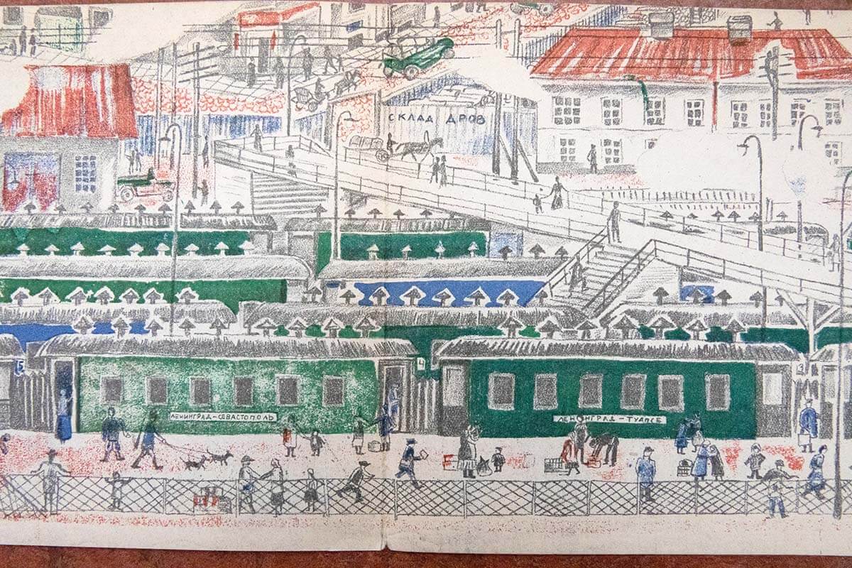 Если же мы возьмём в руки «Вокзал» или «Железную дорогу» , придуманные для совсем маленьких детей, то сможем почувствовать, как любила художница то, что изображала. Башенки, рельсы, вагончики во всём их многообразии. И, конечно, это всё имело и познавательный эффект. Увидев такие рисунки, ребёнок никогда уже не путал, что в каких товарных вагонах перевозят — бочки, брёвна или цемент.