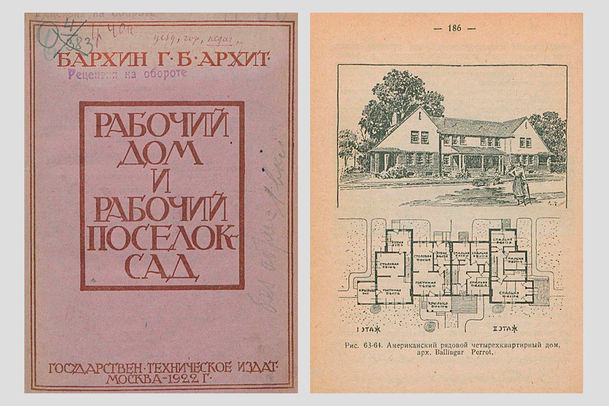 Титульный лист и иллюстрация из книги «Рабочий дом и рабочий посёлок-сад»