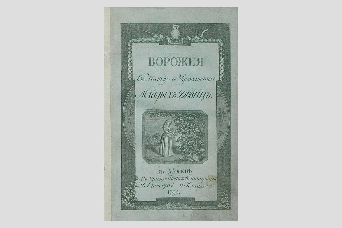 Эту трагическую историю мы прочли не в сентиментальном романе, а в гадательной книге «Ворожея в пользу и удовольствие младых девиц» , изданной в 1795 году. Такое предзнаменование записано в книге на дату выхода этого обзора — 3 августа. Но если бы мы решили погадать на «Ворожее» 5 января, то нашли бы трогательное предостережение не пить слишком много кофе, а 22 февраля узнали бы способ встретить мужа: «Когда ты вывяжешь двенадцать пар чулков, и сделаешь двенадцать рубашек да восемнадцать чепчиков, тогда придёт жених искать твоей прилежной руки».