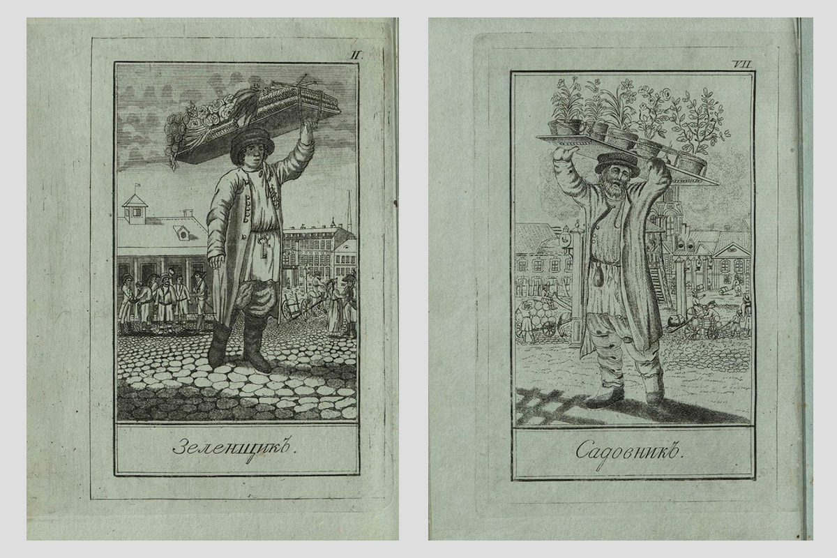 Басин описывает, как выглядели на улицах Санкт-Петербурга разносчики мяса, молока, зелени, клюквы, игрушек и утвари. Разносчик икры — с берестяными туесками, где лежит свежепросолённая белужья или осетровая икра. Молочницы зимой возят молоко на санках, а летом носят на коромыслах, и «голос сих молошниц весьма преразлив, которыя, крича, идучи по улице, так сводят его жалостно, как бы оплакивали усопшаго».