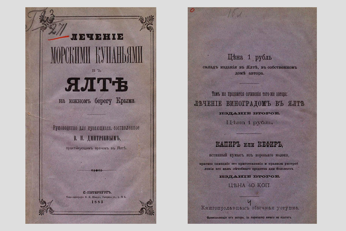В 1860-х годах бывший военный врач Владимир Николаевич Дмитриев задался целью организовать на Южном берегу Крыма курорты не хуже, чем в Европе. Он изучил климат Крымского побережья, построив метеостанцию; написал несколько книг о пользе морской воды у побережья Крыма и о пользе морских купаний; разработал систему лечения виноградом и кефиром; проложил в горах экскурсионные тропы; открыл естественно-исторический музей. В книге «Лечение морскими купаньями в Ялте на южном берегу Крыма» Дмитриев сетует на то, что отдыхающие купаются неграмотно: «Купаются не только здоровые, но и больные, не справляясь ни с температурой воды, ни со временем дня, не обращая внимания на состояние организма, и против всякого ожидания случаи вредного действия такого неосторожного обращения со средством весьма сильным встречаются не часто».