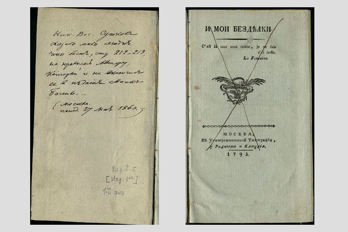 В этом экземпляре «И моих безделок» много корректурных пометок, а на обороте форзаца — запись: «Николай Васильевич Сушков сказал мне сегодня, что басня, стр. 212—213, не нравилась автору, который и не включил её в издание своих басен». Николай Васильевич Сушков — поэт, драматург, журналист — был близко знаком с Михаилом Александровичем, племянником Ивана Дмитриева, и с Петром Андреевичем Вяземским, биографом автора «И моих безделок».