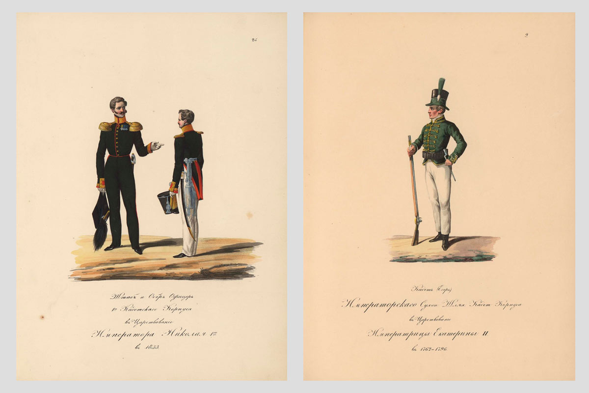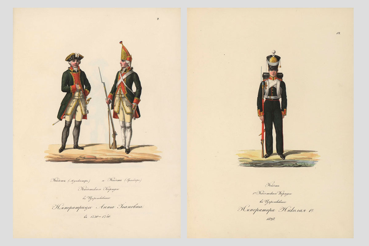 Красочный альбом , где собраны мундиры воспитанников Первого кадетского корпуса в Санкт-Петербурге за первое столетие его существования, был издан в 1833 году. Здесь есть изображения того, как выглядели воспитанники в разные эпохи: при Анне Иоанновне, Елизавете Петровне, Екатерине II, Павле I, Александре I и Николае I. На последней странице альбома есть схема развития территории Кадетского корпуса — каким был Меншиковский дворец до открытия в нём Кадетского корпуса и как он перестраивался при Екатерине II и после неё.