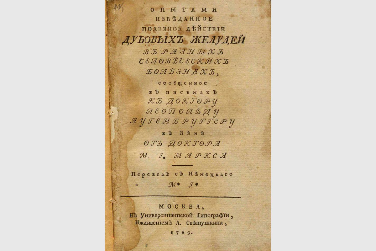 Книга «Опытами изведанное полезное действие дубовых желудей в разных человеческих болезнях» была напечатана в 1789 году в Москве. Она рассказывает, как с помощью желудей справиться с чахоткой, кашлем, поносом, падучей болезнью и другими недугами.