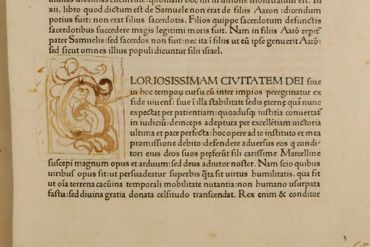 Роскошная инкунабула (так называется книга, напечатанная в Европе до 1501 года) содержит четвёртое издание труда Аврелия Августина «О граде Божьем». Эта книга датируется 1470 годом. Её переплётные крышки сделаны из дерева и инкрустированы деревянными пластинками другого цвета, форзацы — из ткани с цветочным узором. Особенность шрифта антиква, которым набрано сочинение «О граде Божием», — то, что буквы в нём не так тесно поставлены, как в более поздних книгах, где печатники пытались оптимизировать траты бумаги. На листах книги есть рукописные пометы, а буквицы, нарисованные вручную, производят впечатление неоконченных. «О граде Божьем» стала последней книгой, которую создал первопечатник Венеции Иоганн фон Шпейер. Он не успел закончить инкунабулу, и после его смерти работу над книгой завершил его брат, Венделин фон Шпейер.