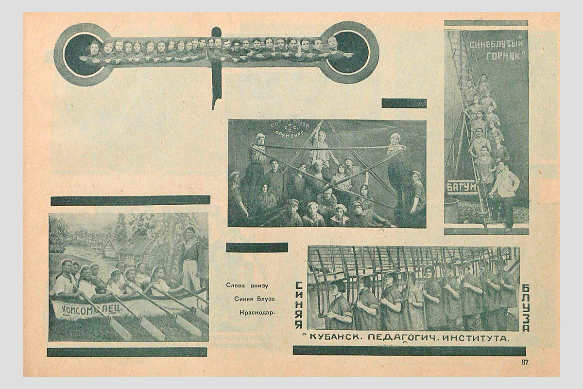 Альбом «Синяя блуза» рассказывает об истории этого движения: в 1923 году оно трансформировалось из «живой газеты». В выступлениях синеблузников соединились «раек, частушка, инсценировка, марш-парад, лубок, оратория, скетч, буффонада, гротеск, водевиль, музыкальная комедия». К 1927 году в советских рабочих клубах и при красных уголках насчитывалось около 7 тысяч кружков синеблузников. Из представлений «Синей блузы» в середине ХХ века родился «Клуб веселых и находчивых».