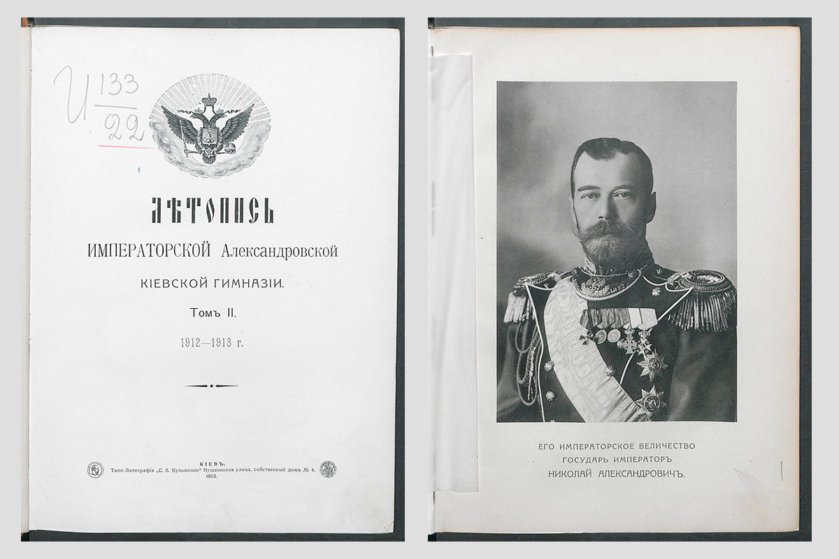 Титульный лист «Летописи Александровской гимназии» и портрет императора Николая II на фронтисписе