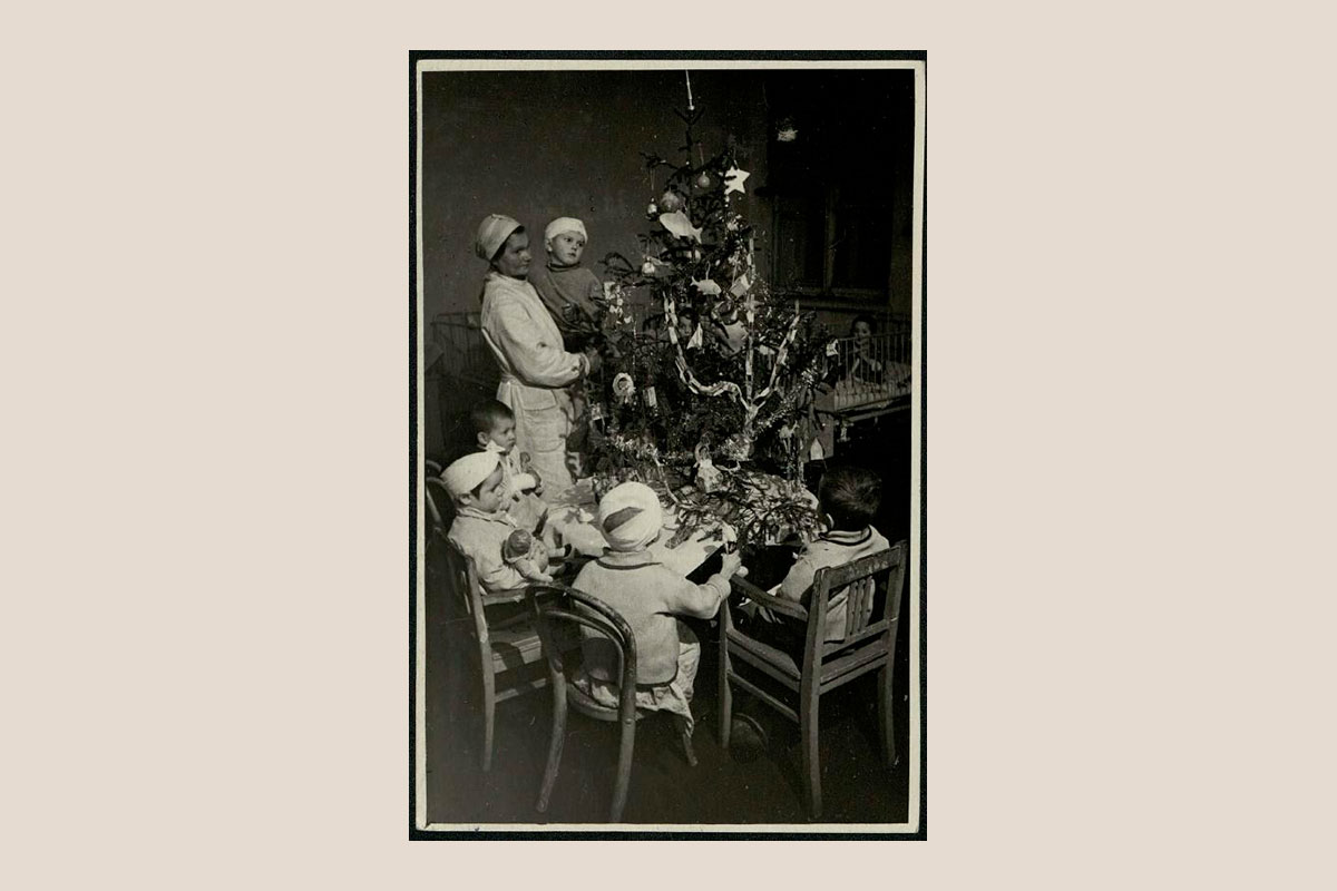 Сергей Струнников. У елки ребята с няней Велюшкиной Е. К. 1944. —