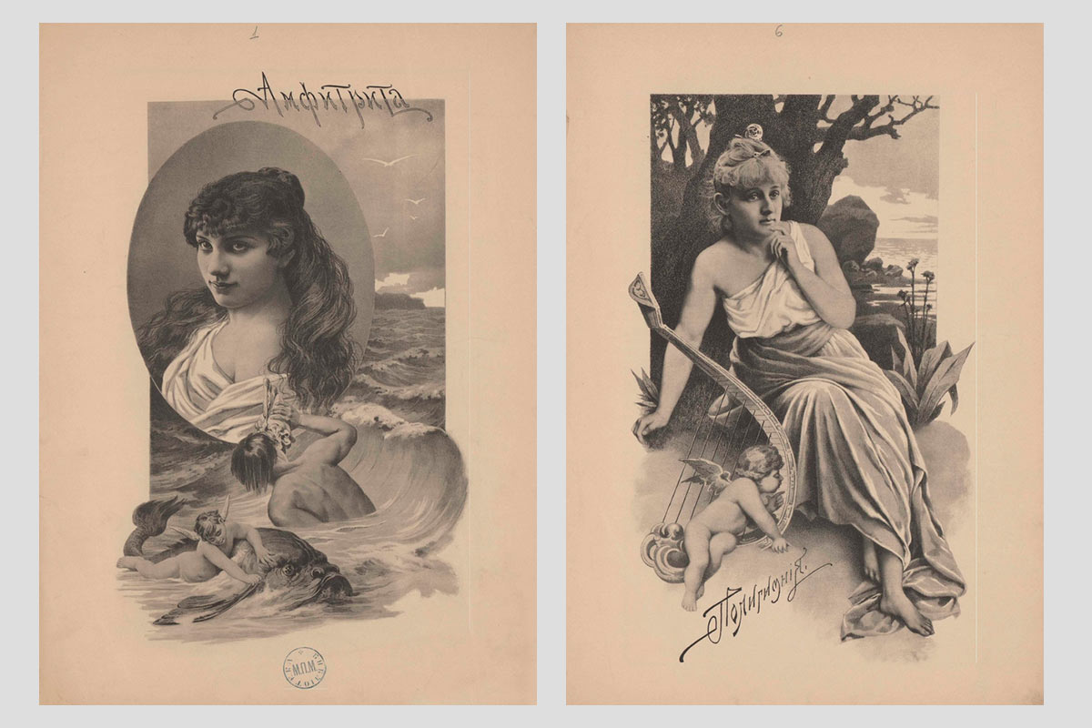Клио — дочь Зевса и Мнемозины; вполне учёная, но и полная завлекательности девица; муза истории; всегда изображается с грифелем в руке и с развернутым бумажным свитком, на котором изображены всевозможные истории из человеческой истории; неудержимая болтунья и веселая, остроумная хохотунья; что бы, где бы, когда бы ни случилось — всё ей известно и до всего ей есть дело; иногда серьёзно призадумывается над судьбами человечества и тогда представляет собою тот пленительный образ, который увековечен нашим художником.