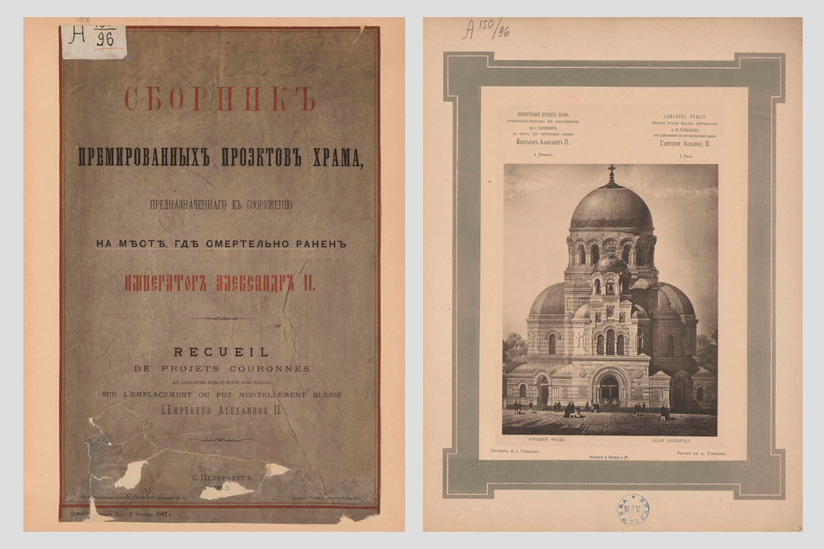 Титульный лист альбома «Сборник премированных проэктов храма, предназначеннаго к сооружению на месте, где смертельно ранен Император Александр II» и проект-победитель работы А. И. Томишко
