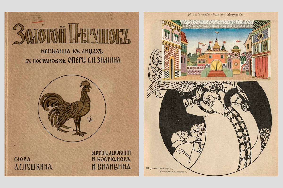 «Оперный театр Зимина» был основан Сергеем Ивановичем Зиминым в 1904 году в Москве. В 1909 году в театре впервые была поставлена опера Николая Римского-Корсакова по сказке Александра Пушкина о Золотом петушке. Для распространения информации об этой постановке Зимин издал книгу «Золотой петушок: Небылица в лицах в постановке Оперы С.И. Зимина» , где сказку Пушкина иллюстрировали эскизы костюмов и декораций, сделанные Иваном Билибиным.
