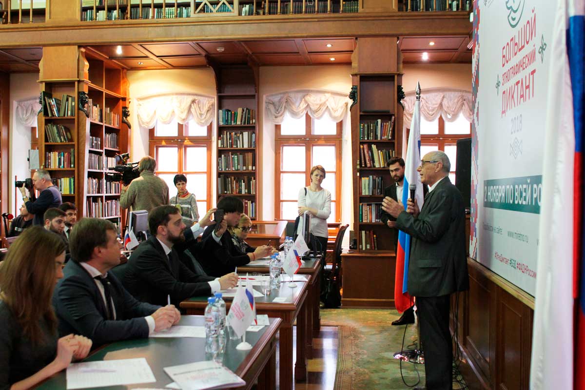 К гостям Дома Пашкова обратился президент библиотеки Виктор Фёдоров: «Мы очень рады, что проведение этнографического диктанта в главной библиотеке России становится традицией. Культурное многообразие нашей многонациональной страны наиболее полно представлено именно здесь, где хранятся документы на языках всех её народов. Я надеюсь, что энергия наших фондов передастся участникам диктанта и способствует достижению оптимальных результатов при его написании».