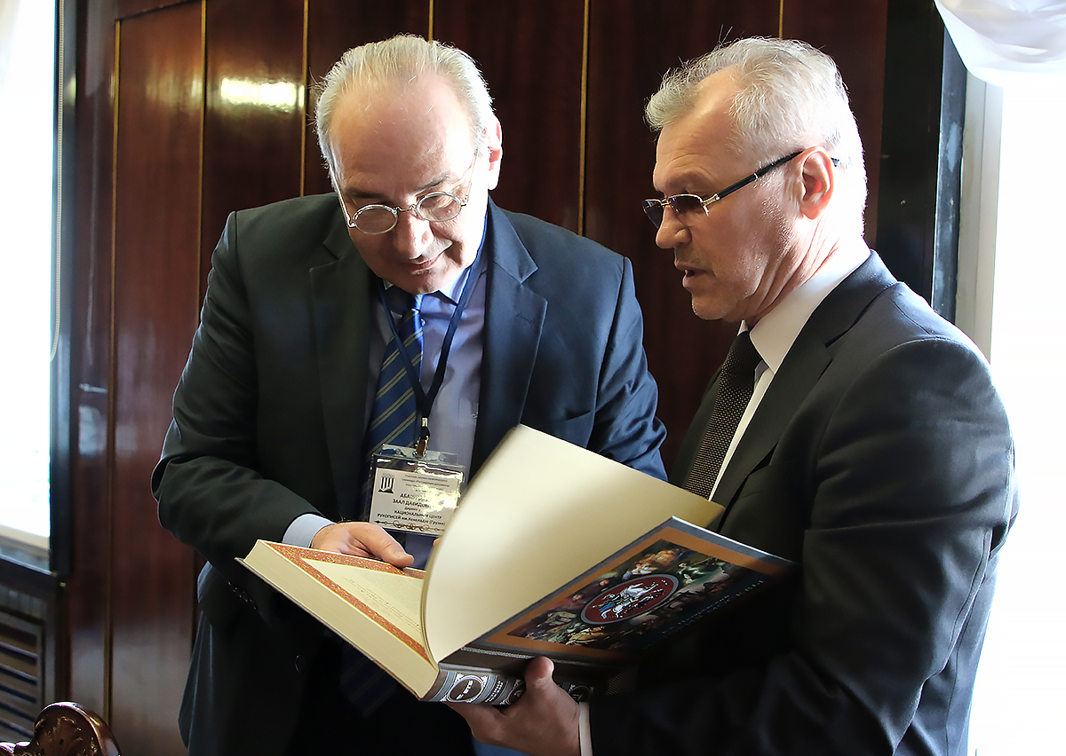 Заал Давидович Абашидзе привёз подарки для библиотеки: книги, изданные в Грузии, и подлинный фрагмент рукописи Александра Сергеевича Грибоедова «Горе от ума». А Владимир Иванович Гнездилов подарил гостю книгу «История Москвы» из серии «Классика мировой литературы: Слово и Образ», которая издается в РГБ.