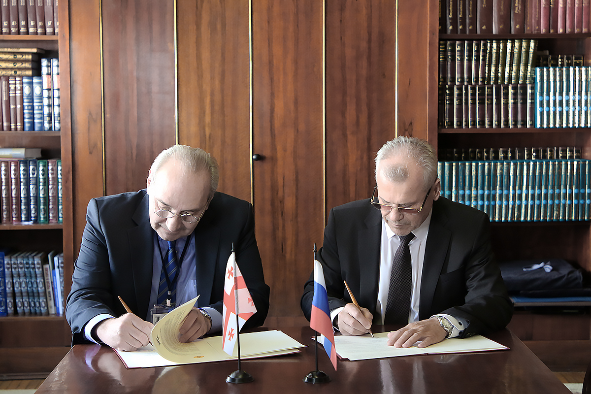 Директор Национального центра рукописей Грузии Заал Давидович Абашидзе и исполняющий обязанности генерального директора РГБ Владимир Иванович Гнездилов подписали Меморандум о сотрудничестве. Фото: Мария Говтвань, РГБ