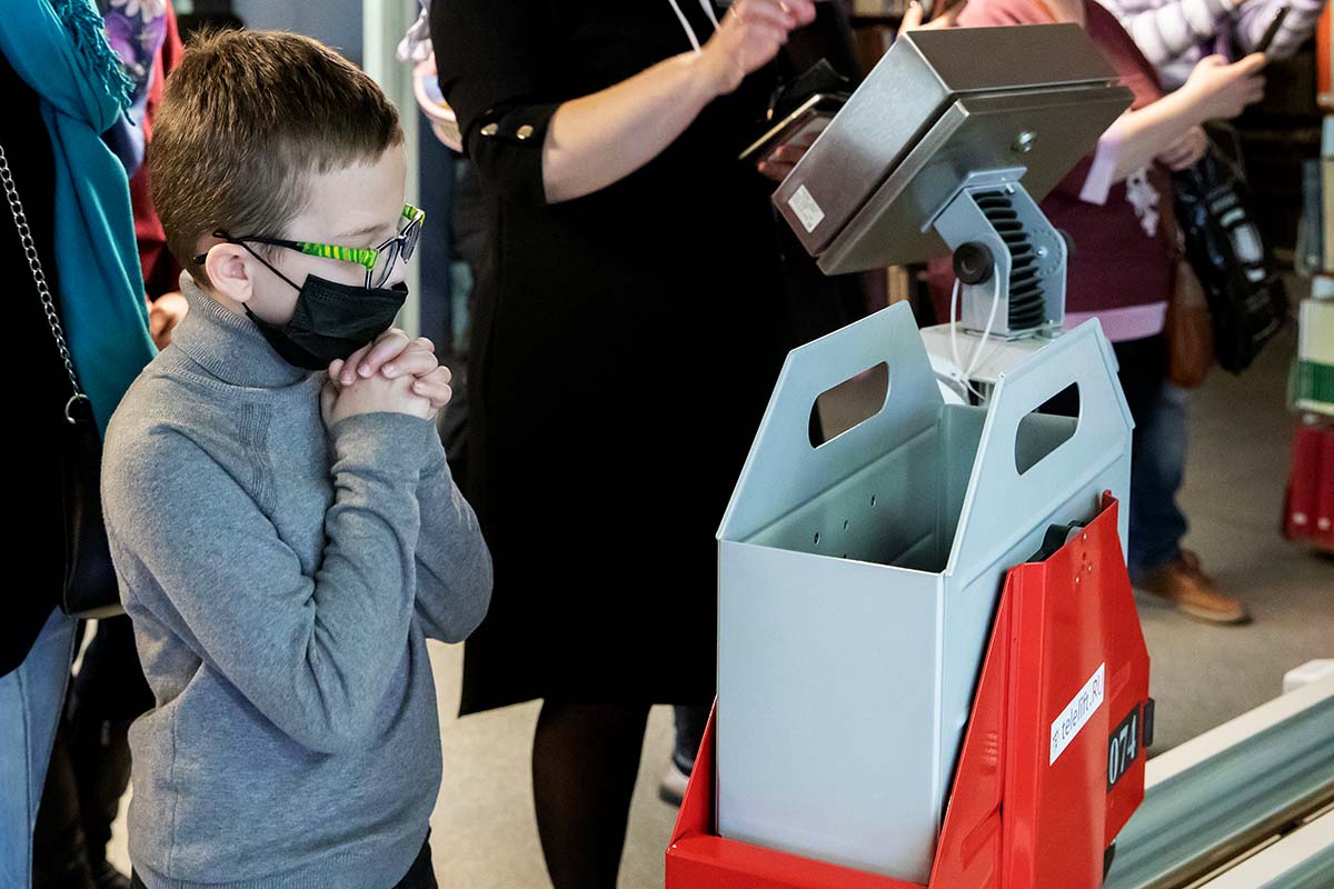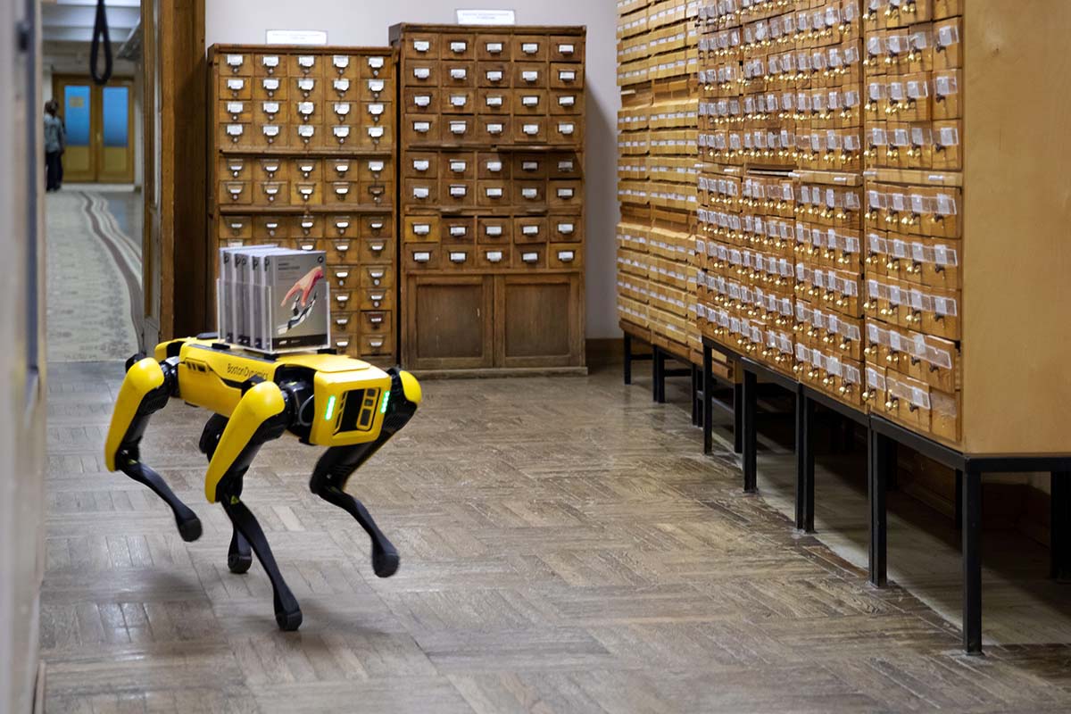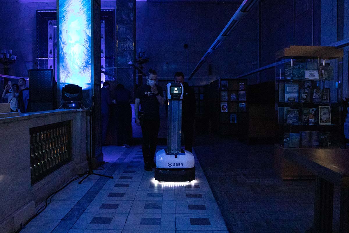 Космос неразрывно связан с новыми достижениями и технологиями, созданными людьми. По маршруту из третьего читального зала в книгохранилище библиотеки с книгами ходили и ездили логистические платформы, предоставленные в Библионочь Лабораторией робототехники Сбера и дочерним предприятием Сбера ООО «Специальные технологии контроля».