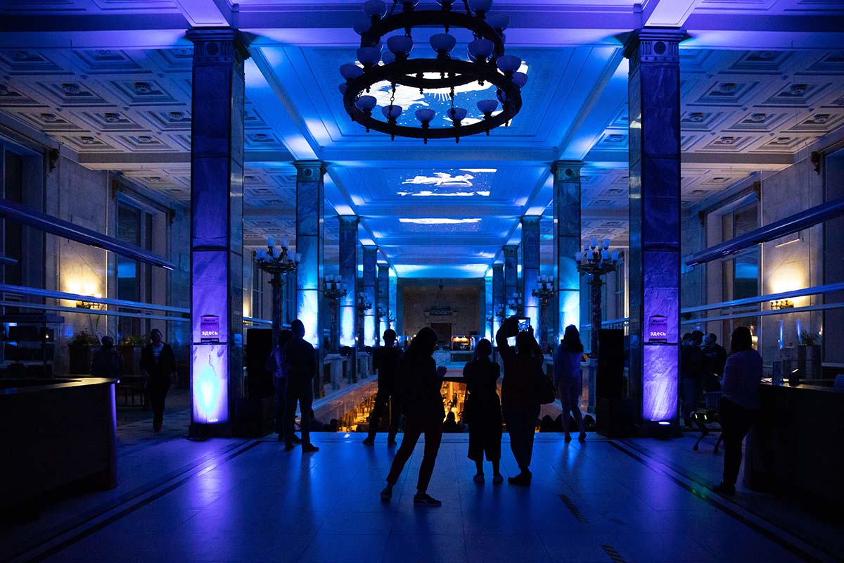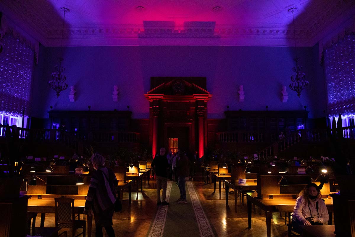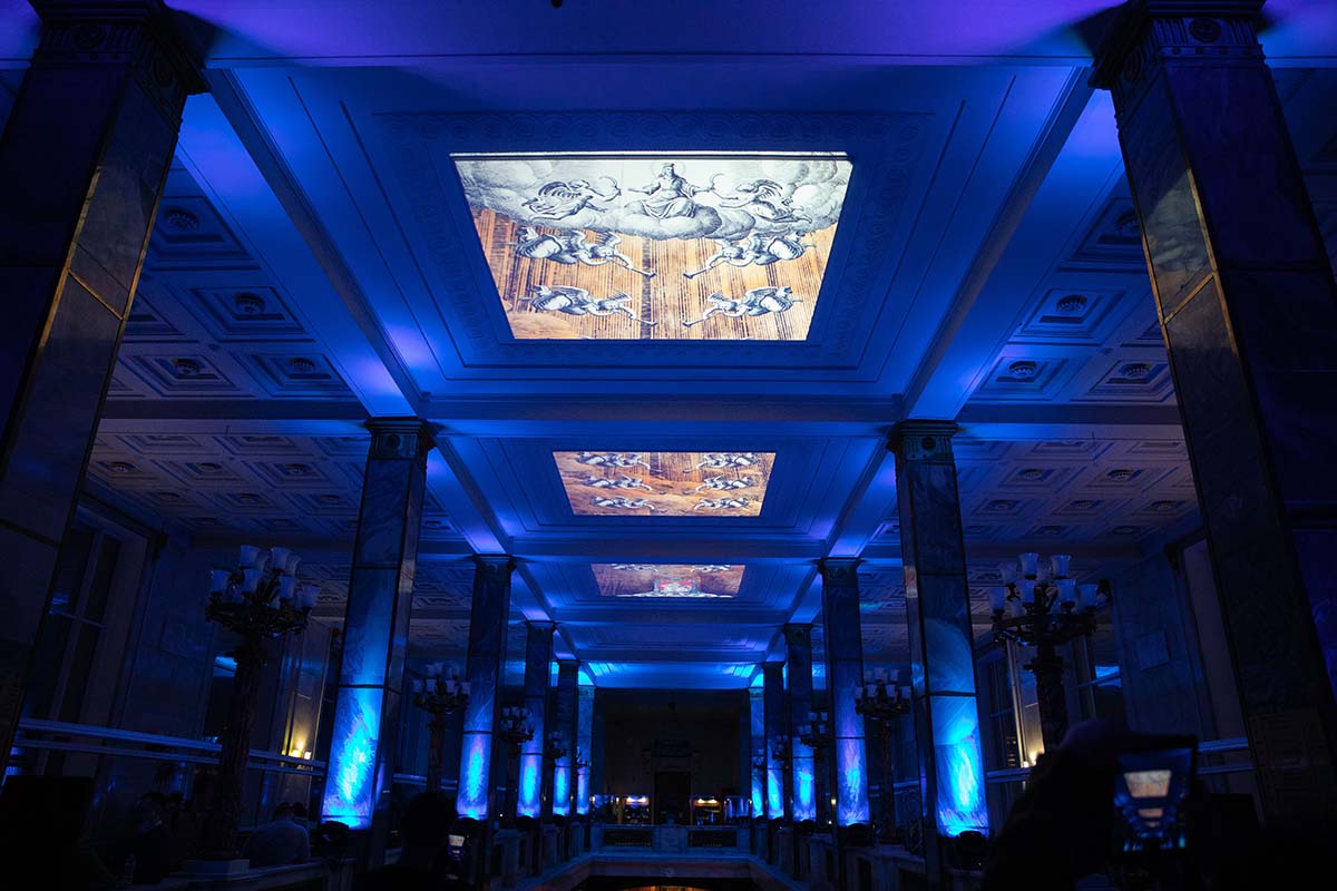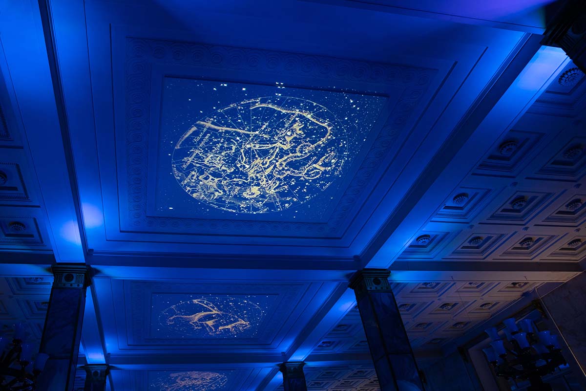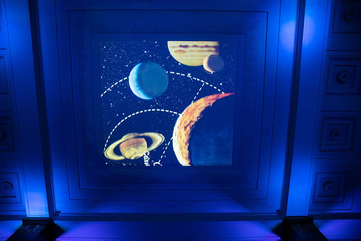 Расположившись на подушках на Мраморной лестнице, гости могли наблюдать на потолке библиотеки удивительное «космическое явление» — сплетение изображений мифических персонажей из книг, анимированные элементы из старинных атласов, космических карт и специально созданных видеокомпозиций.
